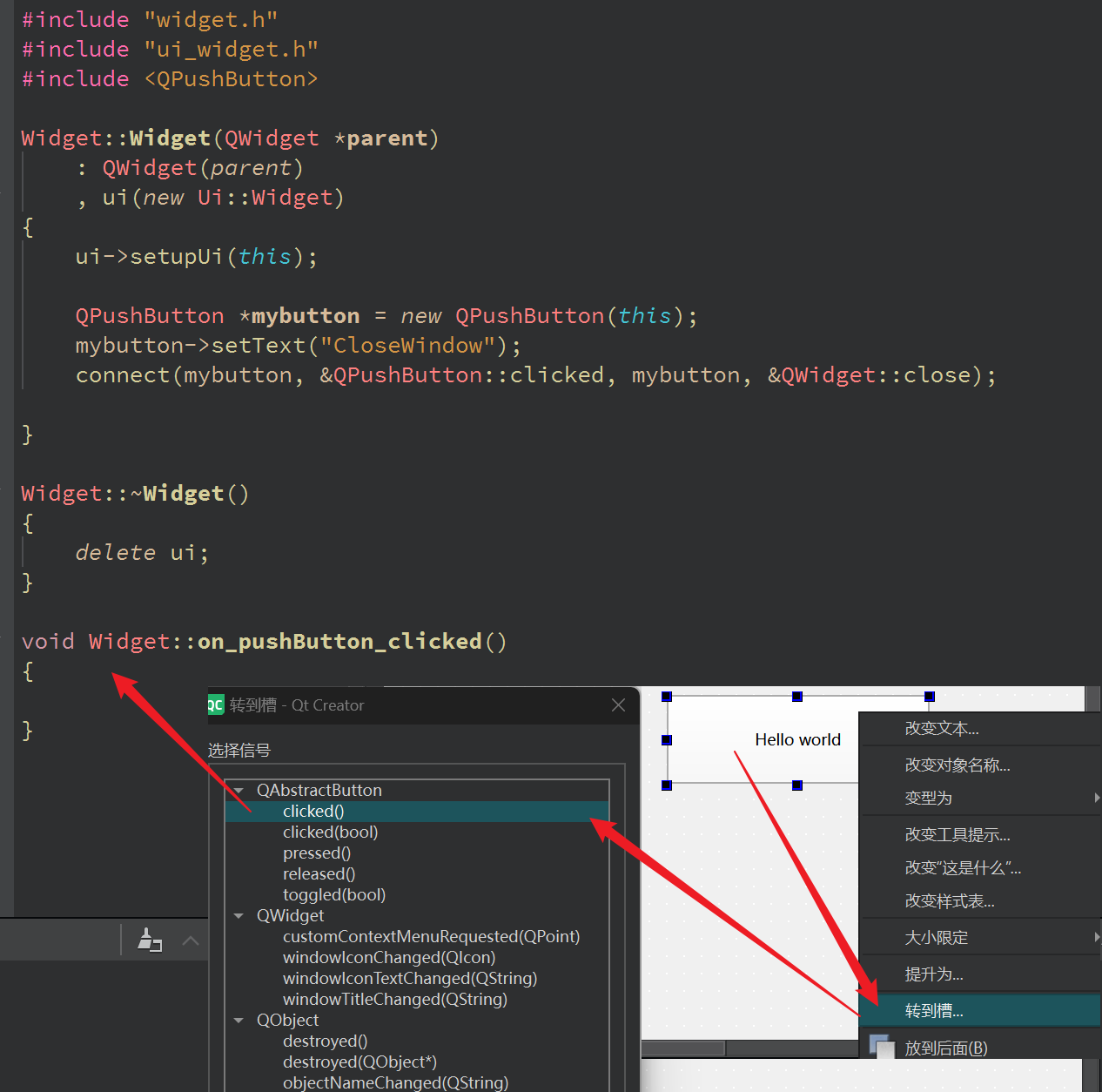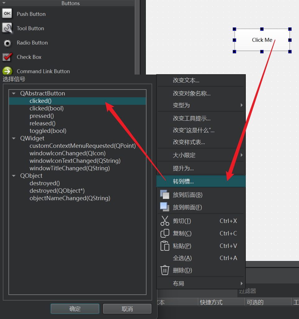 cpp// -------------- widget.h -------------- QT_BEGIN_NAMESPACE namespace Ui { class Widget; } QT_END_NAMESPACE class Widget : public QWidget { Q_OBJECT public: Widget(QWidget *parent = nullptr); ~Widget(); void mysignalHandler(); void clickedHandler(); signals: // 也可以使用 Q_SIGNALS: void my_signal(); private: Ui::Widget *ui; QPushButton *mybutton; }; #endif // WIDGET_H // -------------- widget.cpp -------------- #include "widget.h" #include "ui_widget.h" Widget::Widget(QWidget *parent) : QWidget(parent) , ui(new Ui::Widget) ,mybutton(new QPushButton(this)) { ui->setupUi(this); mybutton->setFixedSize(100, 80); mybutton->move(300, 200); mybutton->setText("Click me"); connect(mybutton, &QPushButton::clicked, this, &Widget::clickedHandler); connect(this, &Widget::my_signal, this, &Widget::mysignalHandler); } Widget::~Widget() { delete ui; } void Widget::mysignalHandler() { this->setWindowTitle("Get a singnal"); } void Widget::clickedHandler() { emit my_signal(); }