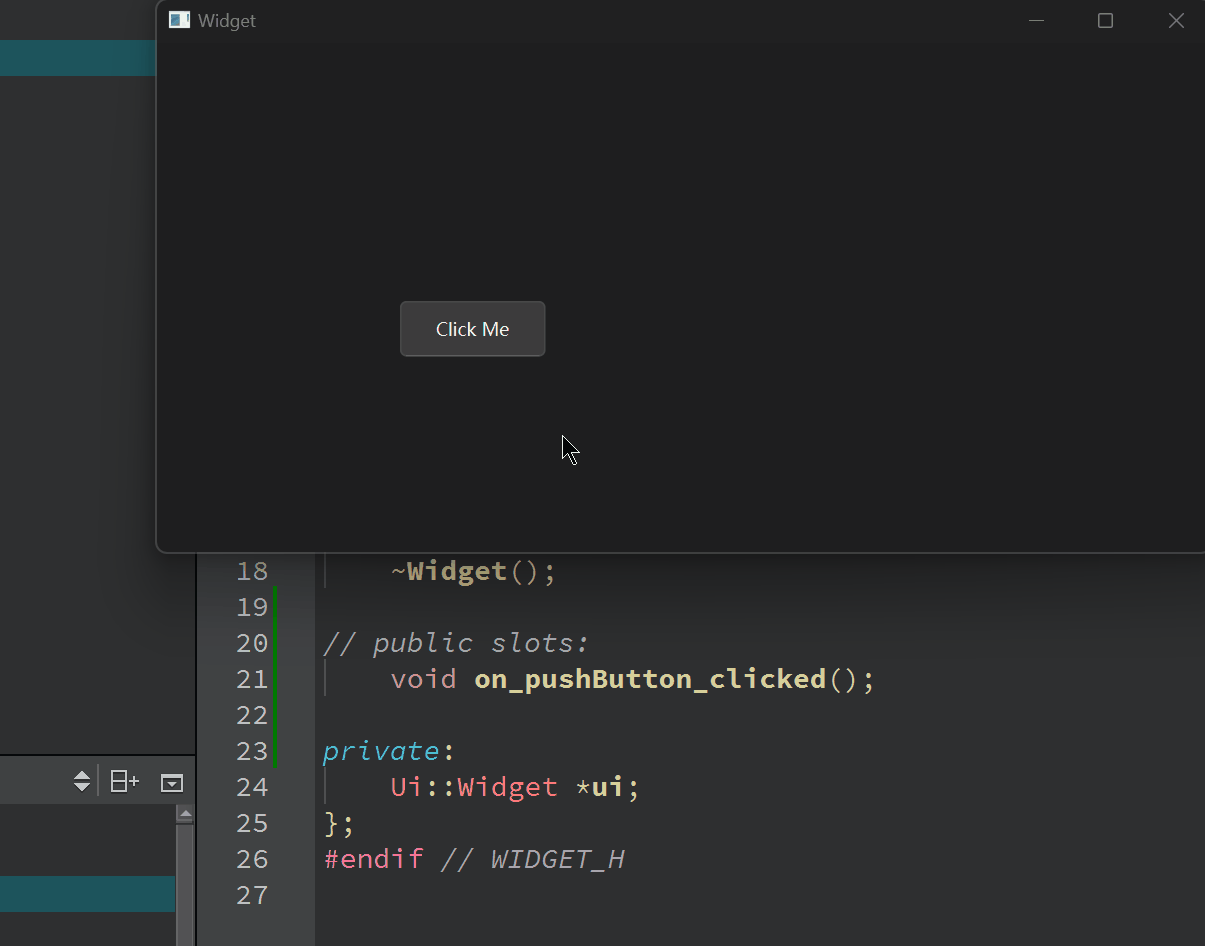 cpp#include "widget.h" #include "ui_widget.h" Widget::Widget(QWidget *parent) : QWidget(parent) , ui(new Ui::Widget) , mybutton(new QPushButton(this)) { ui->setupUi(this); mybutton->setText("Click Me!!"); mybutton->setFixedSize(120, 80); mybutton->move(280, 200); connect(mybutton, &QPushButton::clicked, this, &Widget::clickedHandler); connect(this, &Widget::mySignal, this, &Widget::mySignalHandler); } Widget::~Widget() { delete ui; } void Widget::mySignalHandler(const QString &qstr) { mybutton->setText(qstr); mybutton->setFixedSize(300, 150); mybutton->move(200, 100); } void Widget::clickedHandler() { emit mySignal("The Button clicked!", 10, 6.66); }