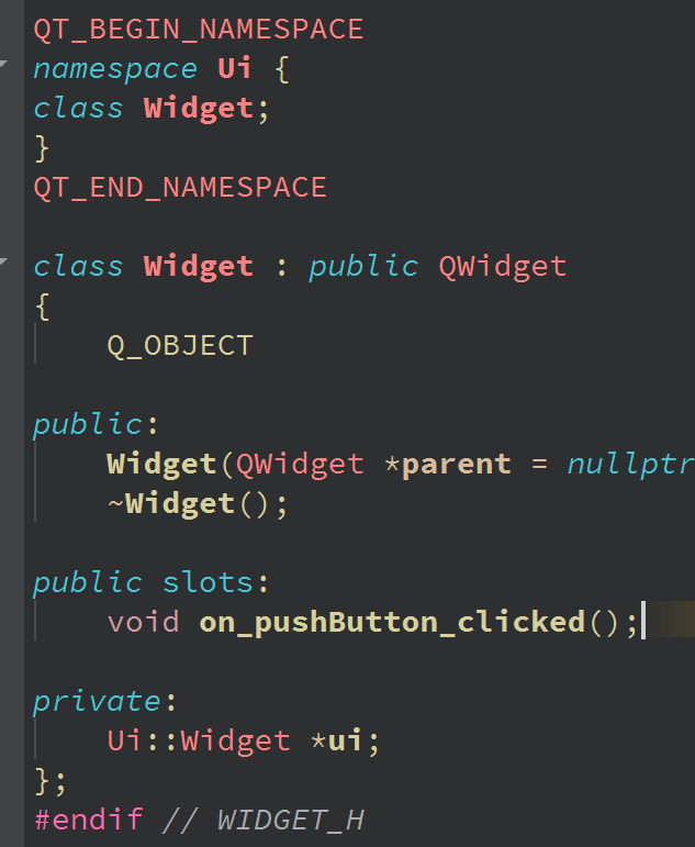 cpp#ifndef WIDGET_H #define WIDGET_H #include <QWidget> #include <QPushButton> #include <QString> QT_BEGIN_NAMESPACE namespace Ui { class Widget; } QT_END_NAMESPACE class Widget : public QWidget { Q_OBJECT public: Widget(QWidget *parent = nullptr); ~Widget(); public slots: void mySignalHandler(const QString&); void clickedHandler(); signals: void mySignal(const QString&, int, double); private: Ui::Widget *ui; QPushButton *mybutton; }; #endif // WIDGET_H