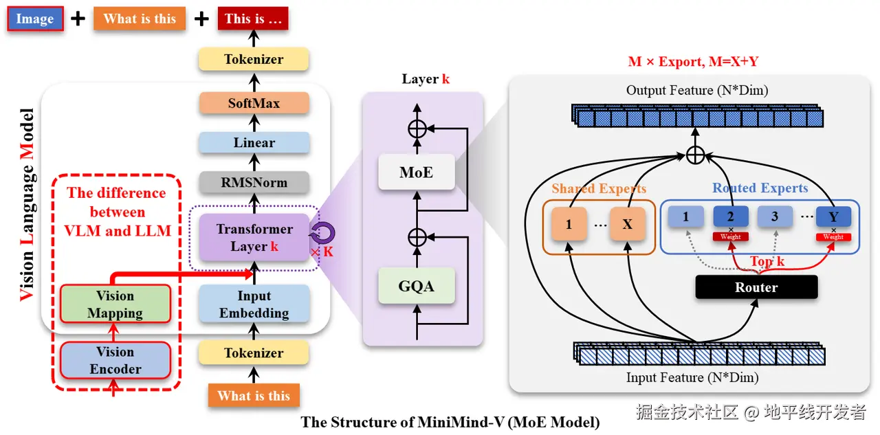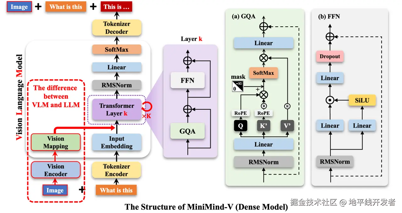 输入的 prompt 与 image 怎么结合到一块去的?其实就是上面介绍的部分。下面以 minimind-V 为例,仅增加 Visual Encoder 和特征投影两个子模块(模态混合分支),从而支持多种模态信息的输入: