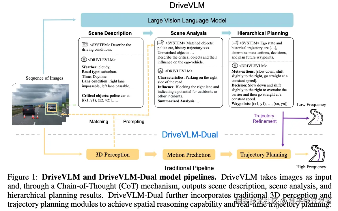 DriveVLM-Dual (快系统)将 DriveVLM 生成的结果作为指导,与 E2E 经典 pipeline(感知识别目标、预测其他目标轨迹、规划自身运行轨迹)融合,提升精度与实时性。