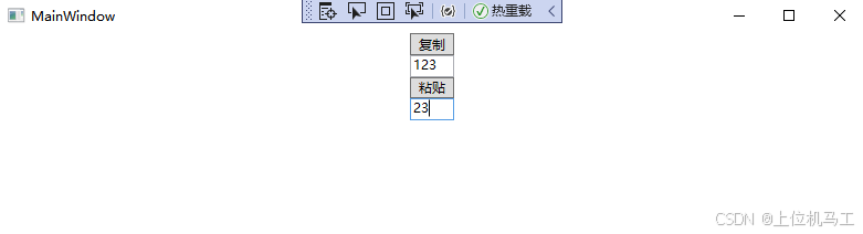 下面的代码中我们先用鼠标选中"123"中的"23",然后点击"复制"按钮,最后点击"粘贴"按钮,这样你就能看到文本"23"被粘贴到最下方的TextBox 中,点击"复制"按钮时就是执行了"ApplicationCommands.Copy"命令,点击"粘贴"按钮就是执行"ApplicationCommands.Paste"命令。