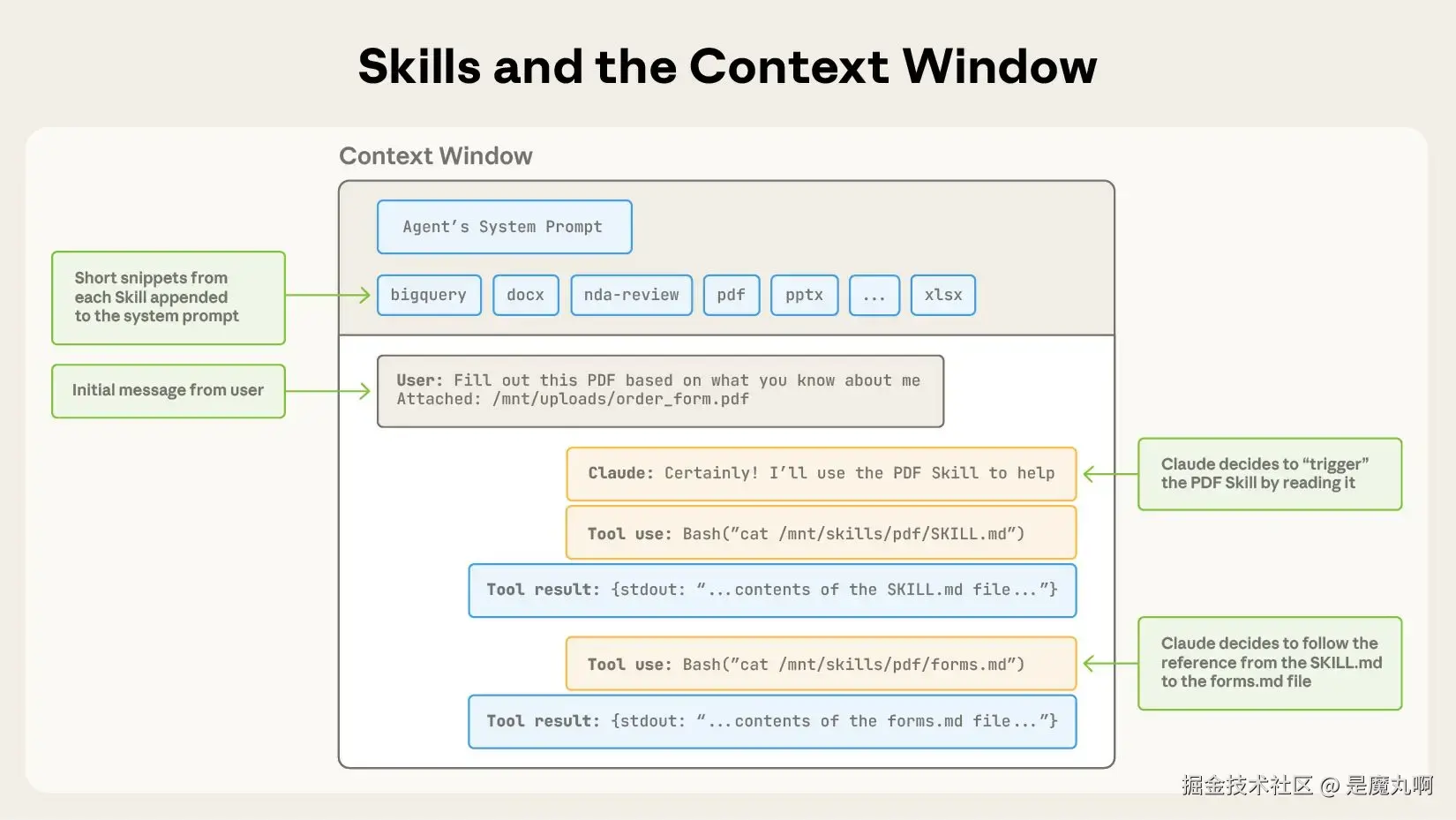下面的图表显示了当用户的消息触发 skill 时上下文窗口如何变化。