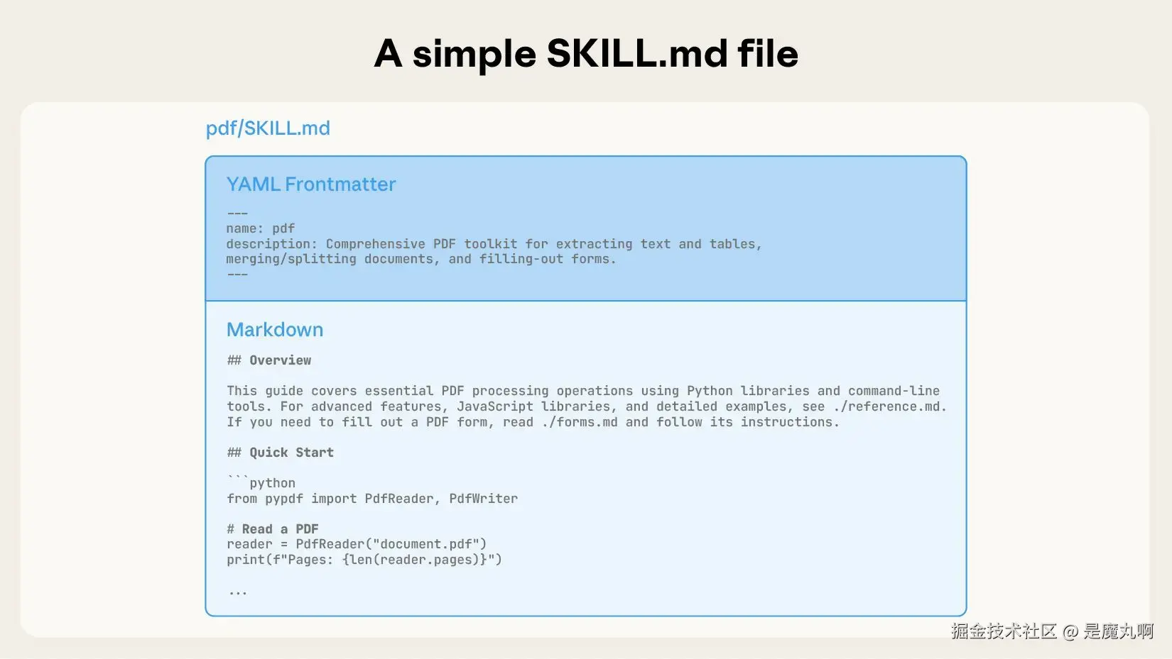 最简单来说,skill 是一个包含 SKILL.md 文件的目录。该文件必须以包含一些必需元数据的 YAML frontmatter 开始:name 和 description。在启动时,agent 会将每个已安装 skill 的 name 和 description 预加载到其系统提示中。