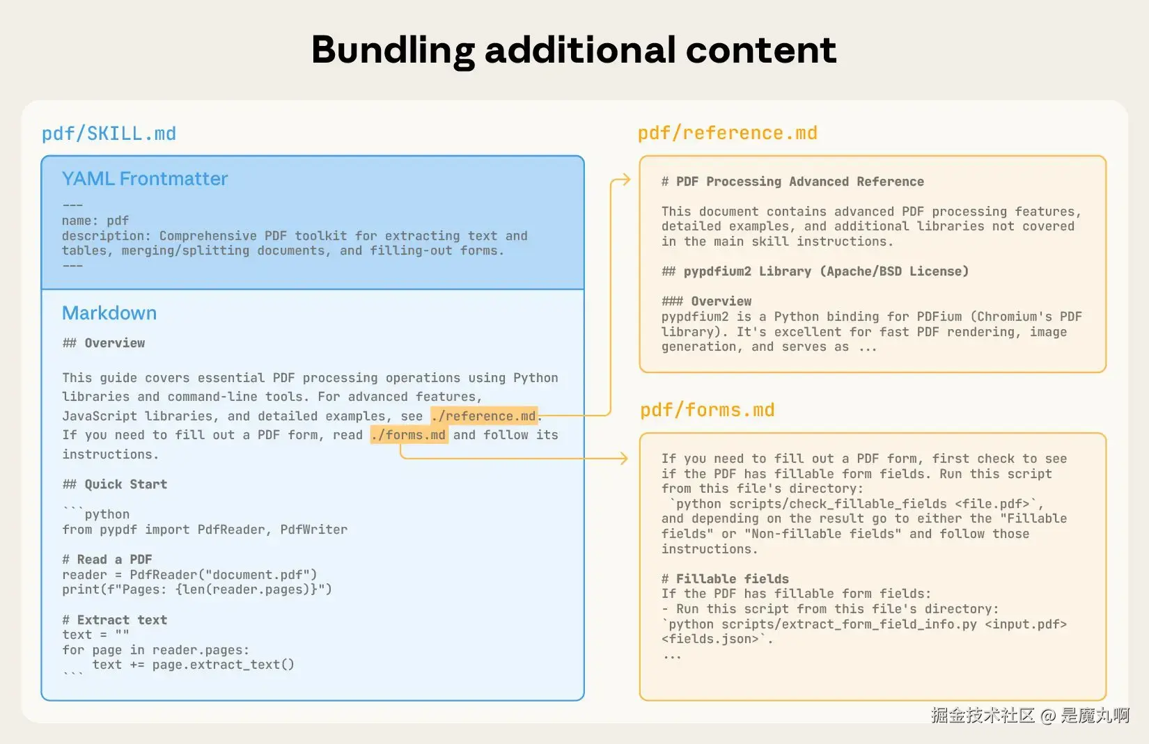 在下面显示的 PDF skill 中,SKILL.md 引用了两个额外文件(reference.md 和 forms.md),skill 作者选择将它们与核心 SKILL.md 捆绑在一起。通过将表单填写指令移到单独的文件(forms.md)中,skill 作者能够保持 skill 的核心精简,相信 Claude 只在填写表单时才会读取 forms.md。