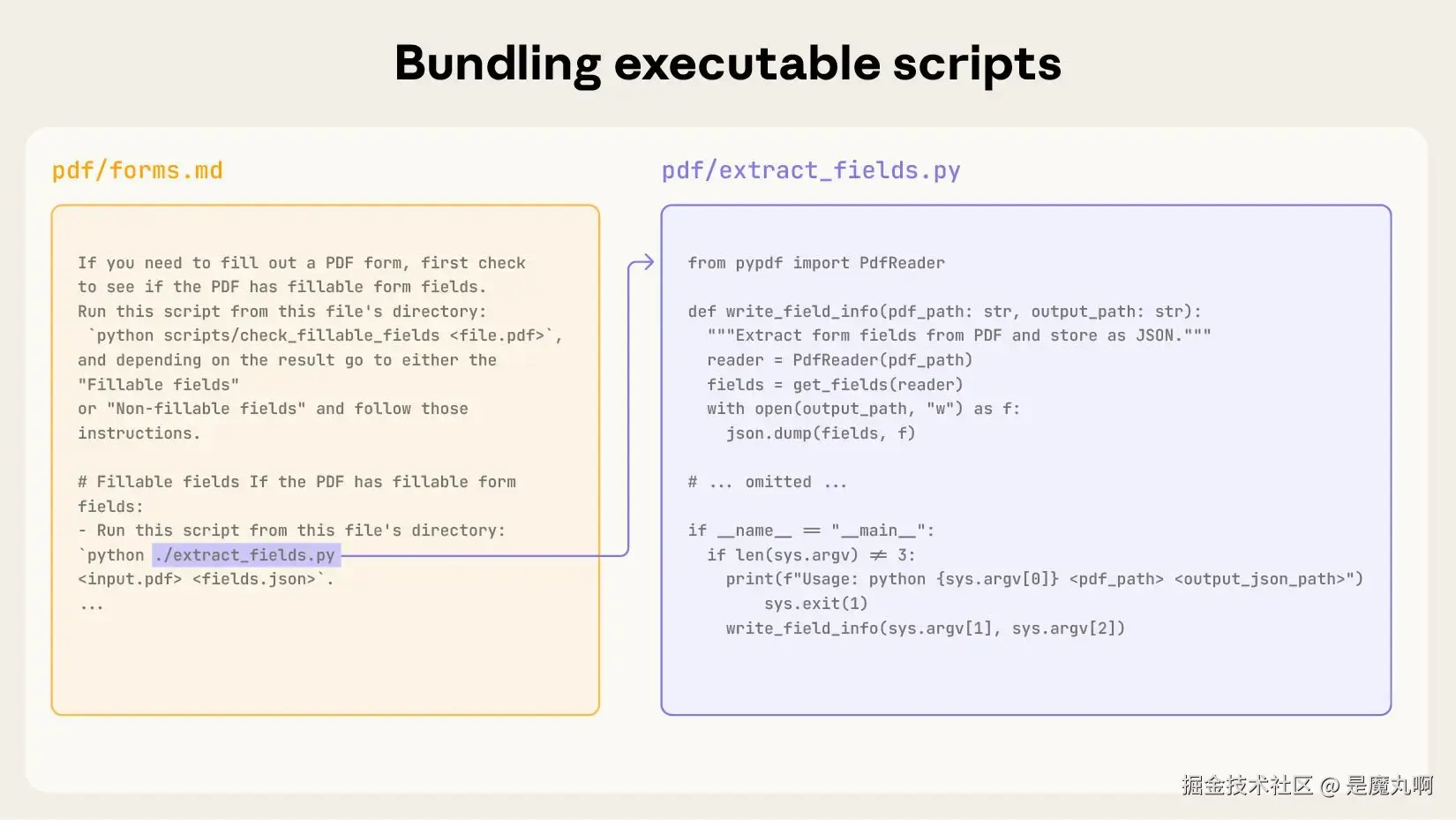 另外,skill中也可以involve脚本,这也是一种大模型(生成范式、灵活性)和代码(高效率、确定性)结合的的一种方式,很make sense。
