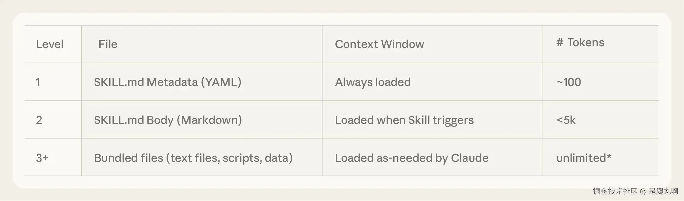 这个元数据是 渐进式披露 的第一级 :它提供足够的信息让 Claude 知道何时应该使用每个 skill,而无需将所有内容加载到上下文中。该文件的实际主体是细节的第二级。如果 Claude 认为 skill 与当前任务相关,它将通过读取完整的 SKILL.md 到上下文中来加载该 skill。