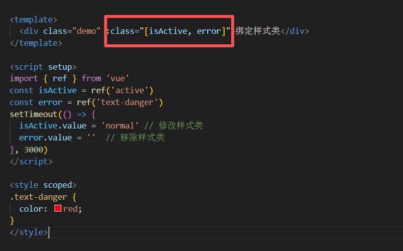 <div class="demo" :class="[isActive, error]">绑定样式类</div>