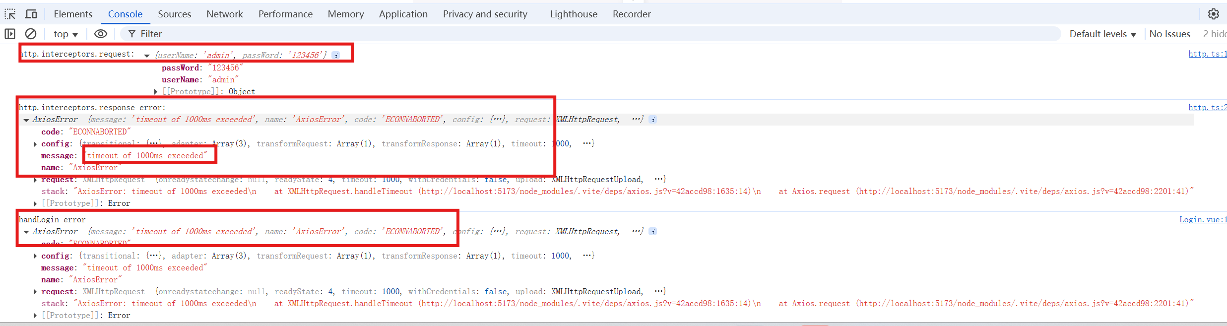 从控制台打印的log来看,我们的拦截器成功拦截了我们在表单中提交的post请求,以及超时的response返回。在http.ts的拦截器中,我们可以对所有的请求和响应进行处理。类似于登录以及其他具体的业务请求,我们就可以在具体的组件文件中用then 或 catch 进行处理。