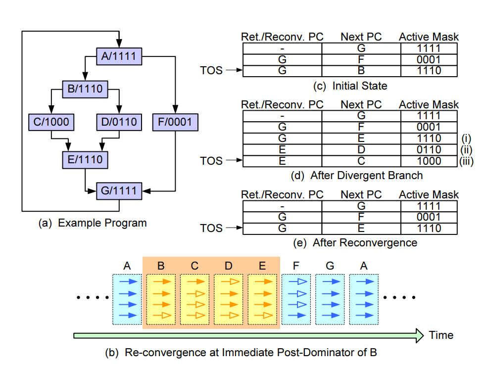 指令跳过无线程执行的路径,减少冗余,但增加指令开销; - 谓词栈+PDOM重收敛模型:用栈存储子线程束的PC和谓词掩码,在分支的立即后支配点(IPDOM)重收敛,支持嵌套分支/循环。