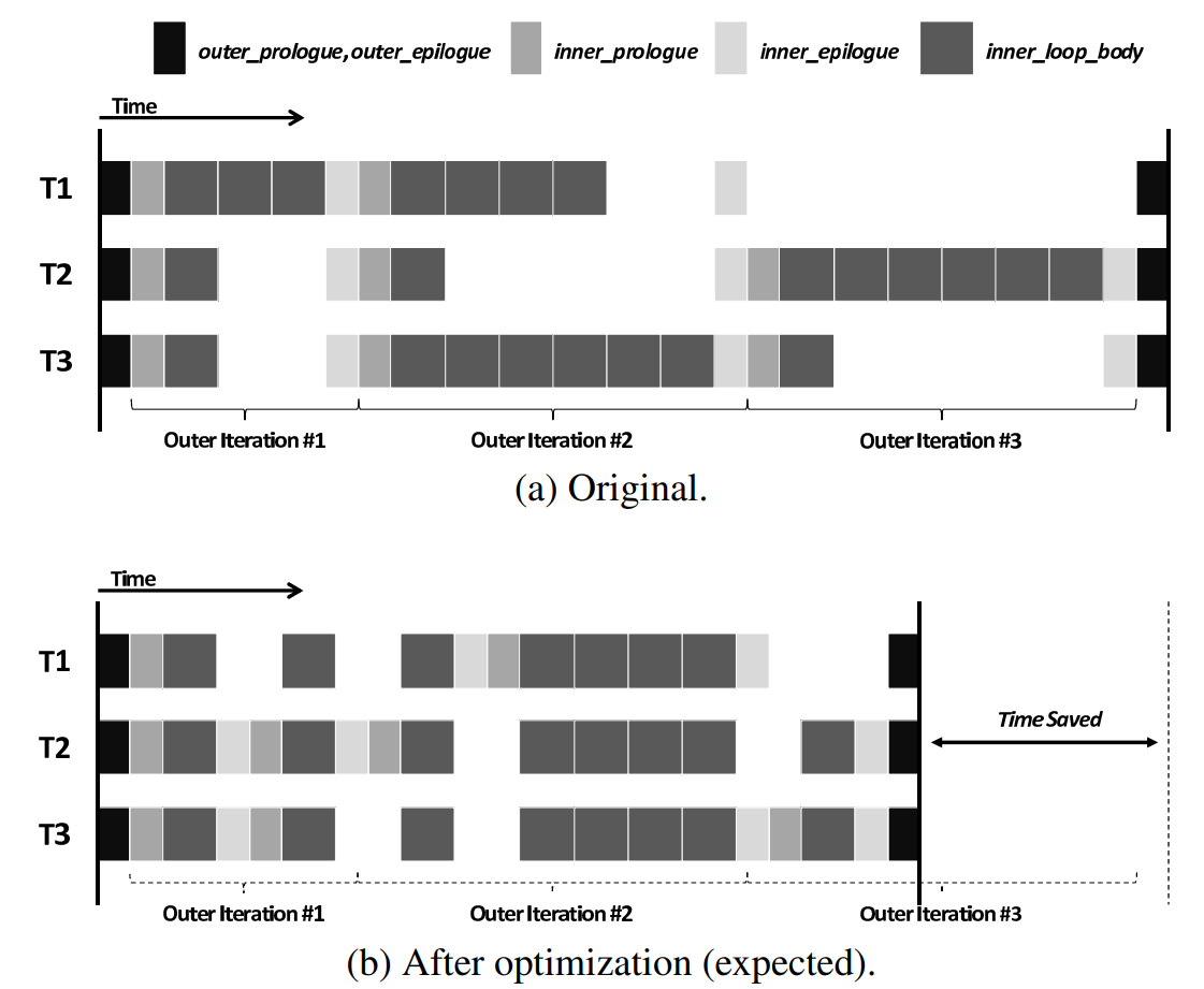 - 核心思想:合并内层发散循环与外层循环,消除"外层迭代等待",紧凑SIMD调度
