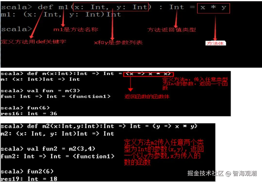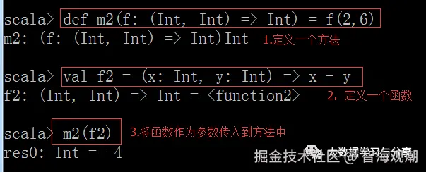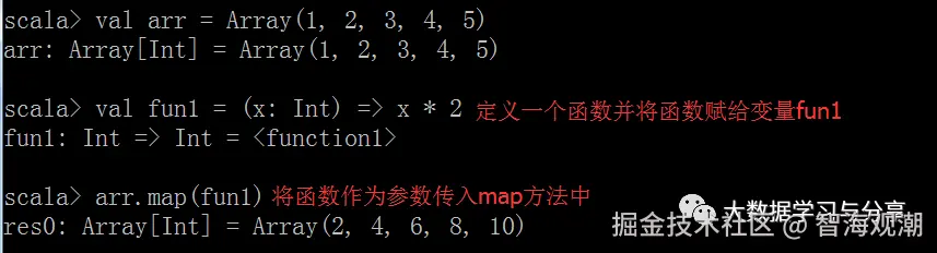 定义函数时格式:val 变量名 = (输入参数类型和个数) => 函数实现和返回值类型和个数。 =:表示将函数赋给一个变量 =>:左面表示输入参数名称、类型和个数,右边表示函数的实现和返回值类型和参数个数