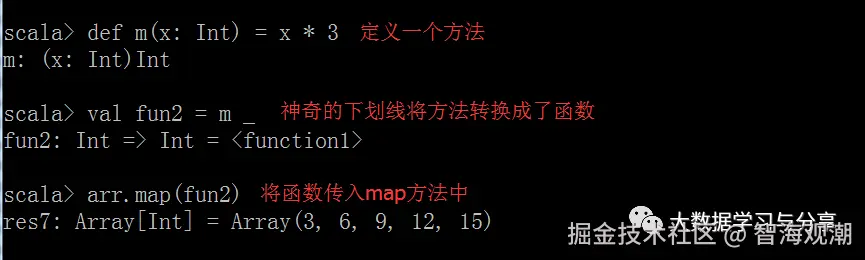 在Scala中,方法和函数是不一样的,最本质的区别是函数可以做为参数传递到方法中,方法可以被转换成函数。