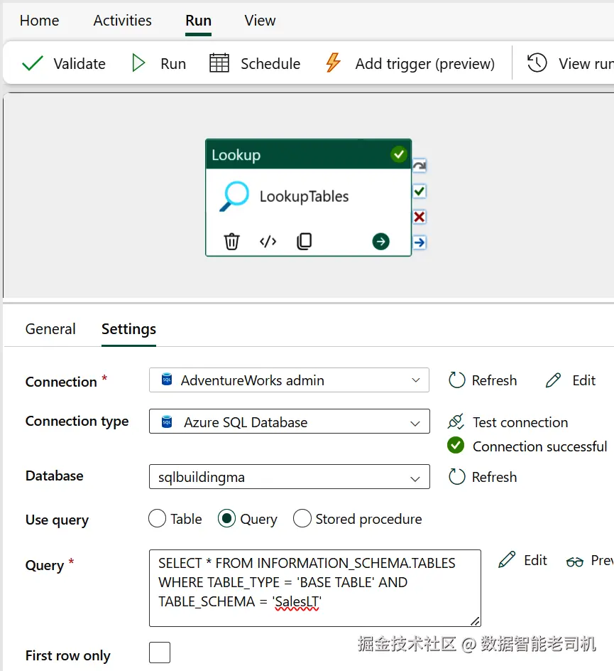 接着点击该活动进行配置:在设置中,选择之前创建的 AdventureWorks Connection 作为读取数据库信息的连接。然后转到 details 部分,在 "Use query" 行选择 Query 单选项以获取所有相关的表名。确保 First row only 不要勾选,以便返回表中的所有行。参见图 5-3 获取更多细节。
