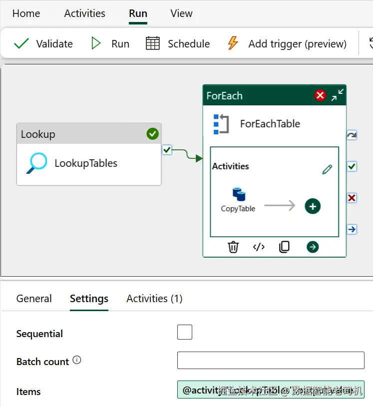 要遍历来自 AdventureWorks 的系统对象信息,请在 ForEach 活动的 Items 选项中添加以下内容:²