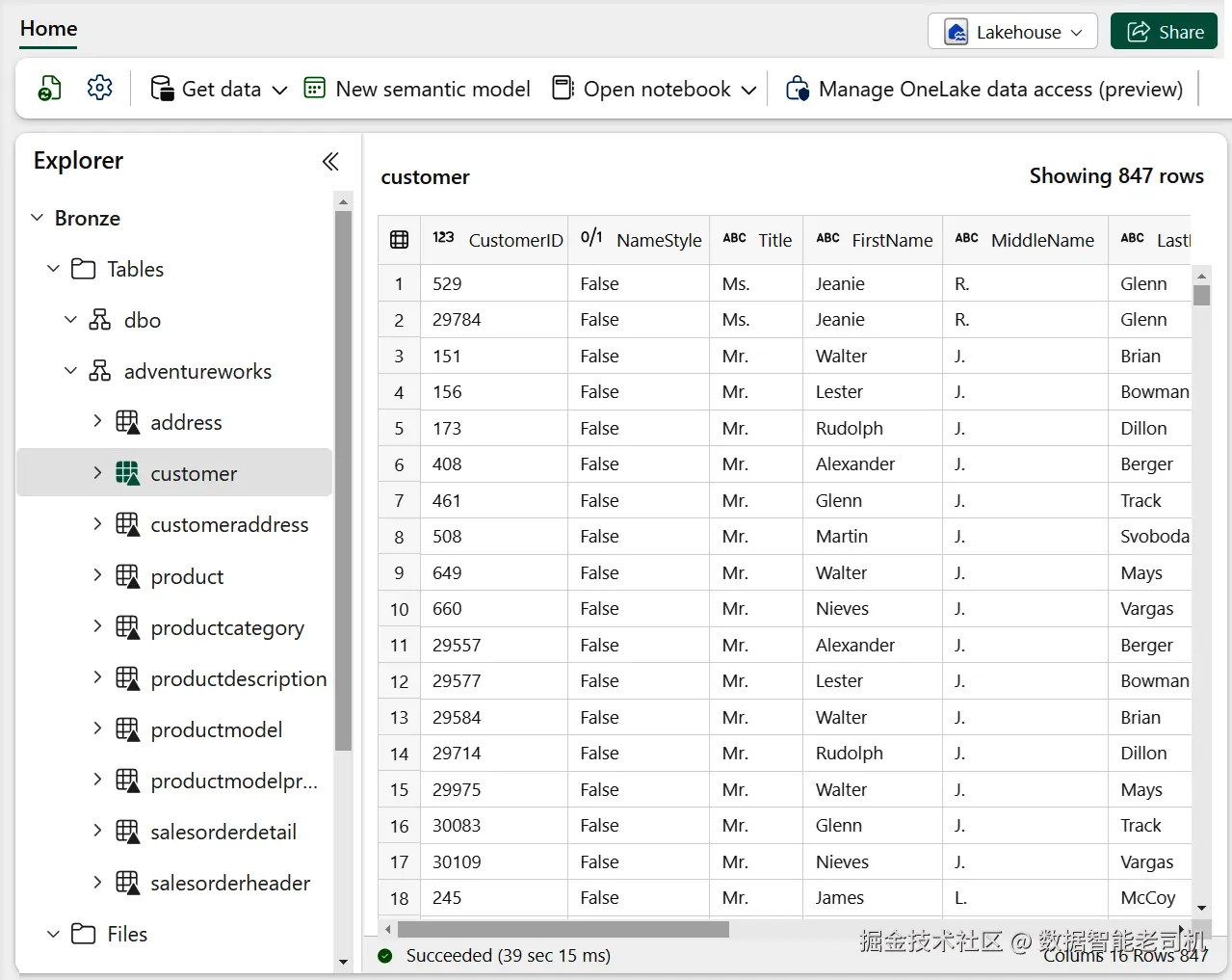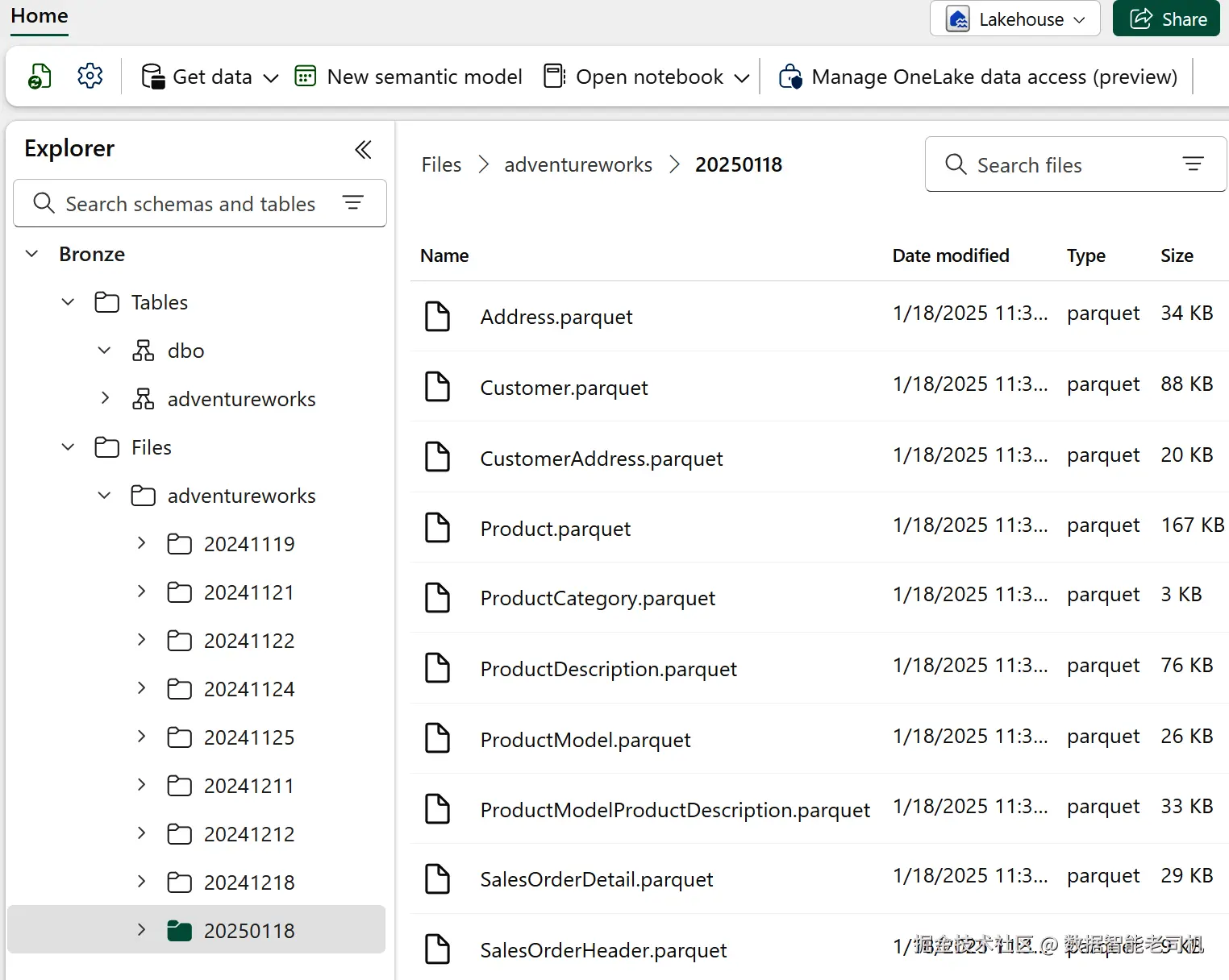 通过该配置,AdventureWorks 数据将以如下路径格式存储并在 Bronze Lakehouse 中按天分区: