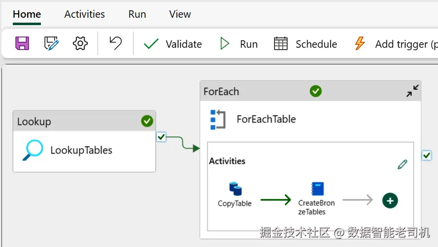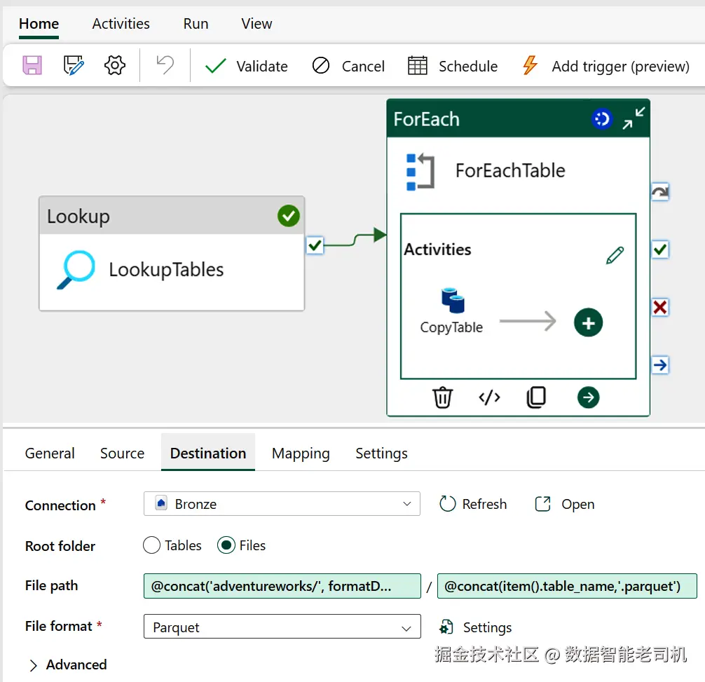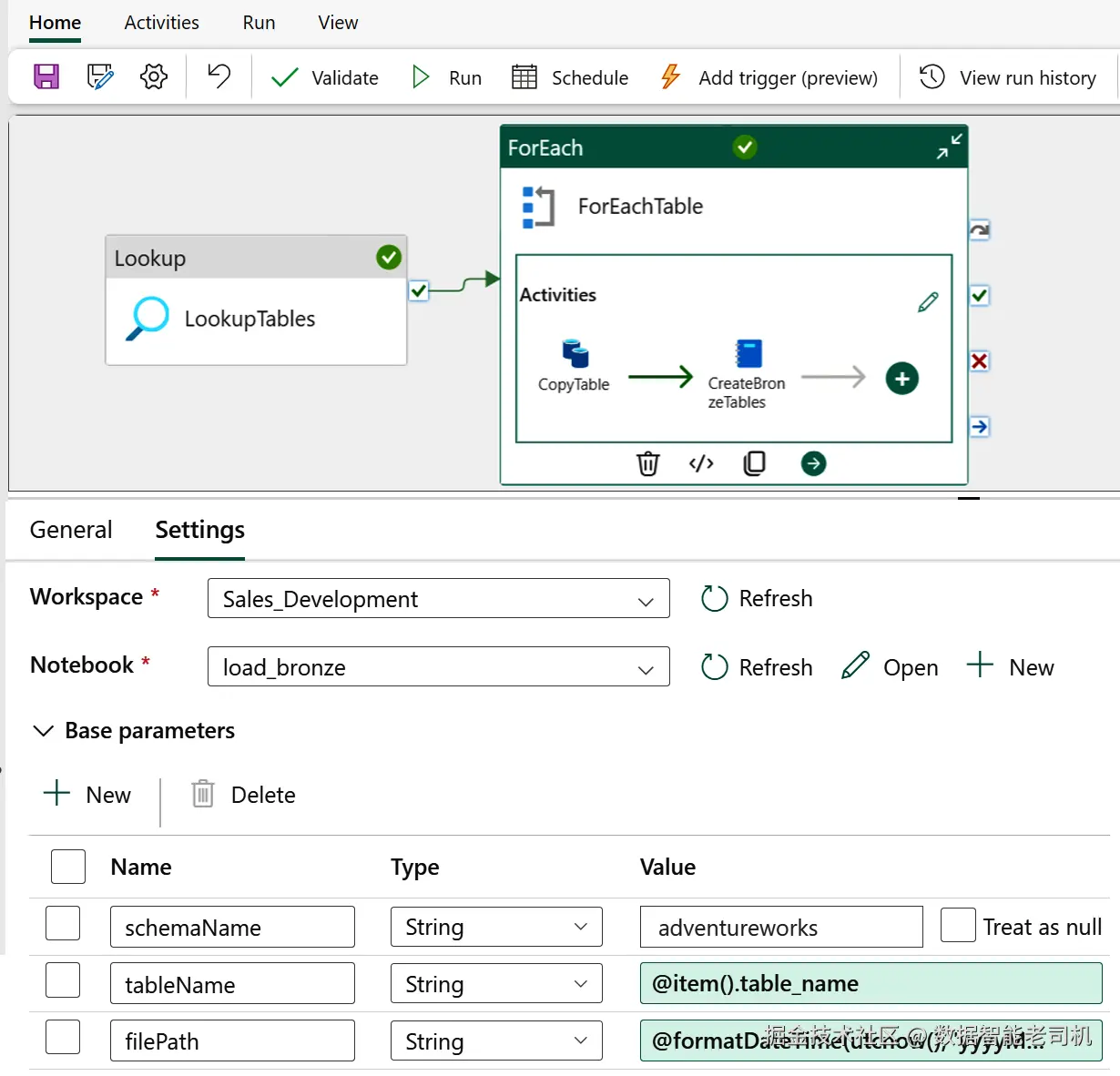 ForEach 是一种控制流活动,用于遍历一个集合并按特定顺序对集合中的每个项执行操作。它常用于数据工程项目,对一组文件或表执行一系列(重复性)操作。在本例中,ForEach 将遍历从 AdventureWorks 示例数据库返回的系统对象信息,并据此把这些表复制到 Bronze Lakehouse。