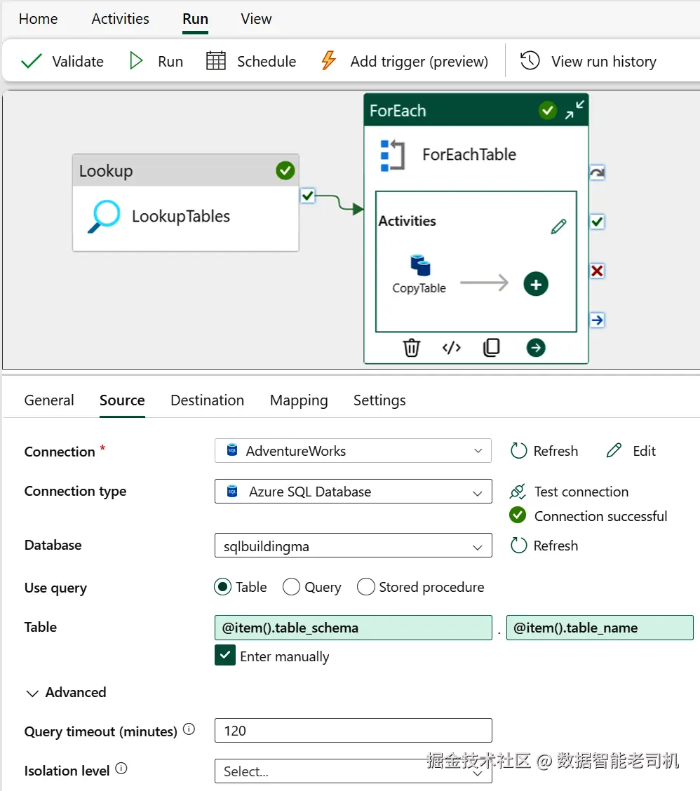 在 Source 属性中,选择 AdventureWorks Connection 以及对应数据库。确保把 TableName 与 SchemaName 指定为输入参数。这些项的值来自 Lookup 活动检索到的元数据: