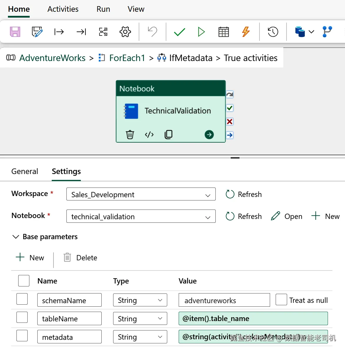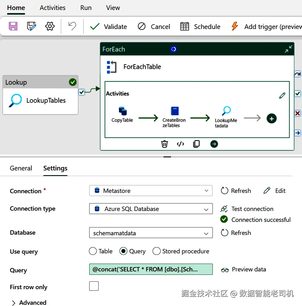 准备好后,回到 Microsoft Fabric。进入 Settings ,将新的 Azure SQL 数据库注册为一个新的连接(Connection),其体验与配置 AdventureWorks 数据库时类似。随后进入数据管道,打开现有的 ForEach 活动;新增一个 Lookup 活动并拖入工作流,将其连接到负责创建 Delta 表的 notebook 步骤。选中该 Lookup 活动,在 Settings 中将 Connection 设为新的元数据存储。查询(Query)需要以表名作为输入进行调用,将 Query 字段更新为: