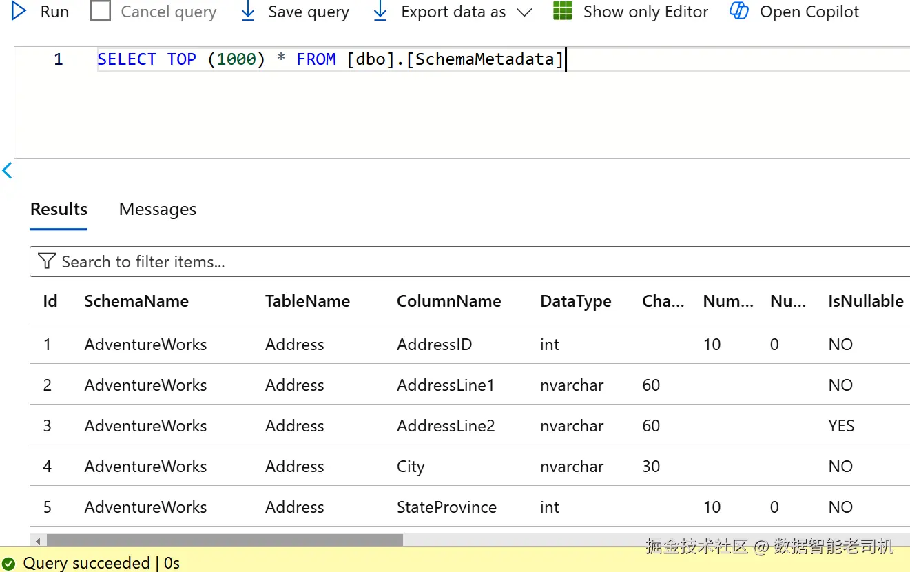 收集到 AdventureWorks 的模式元数据后,回到元数据存储的 Azure SQL 数据库中执行插入。示例如下: