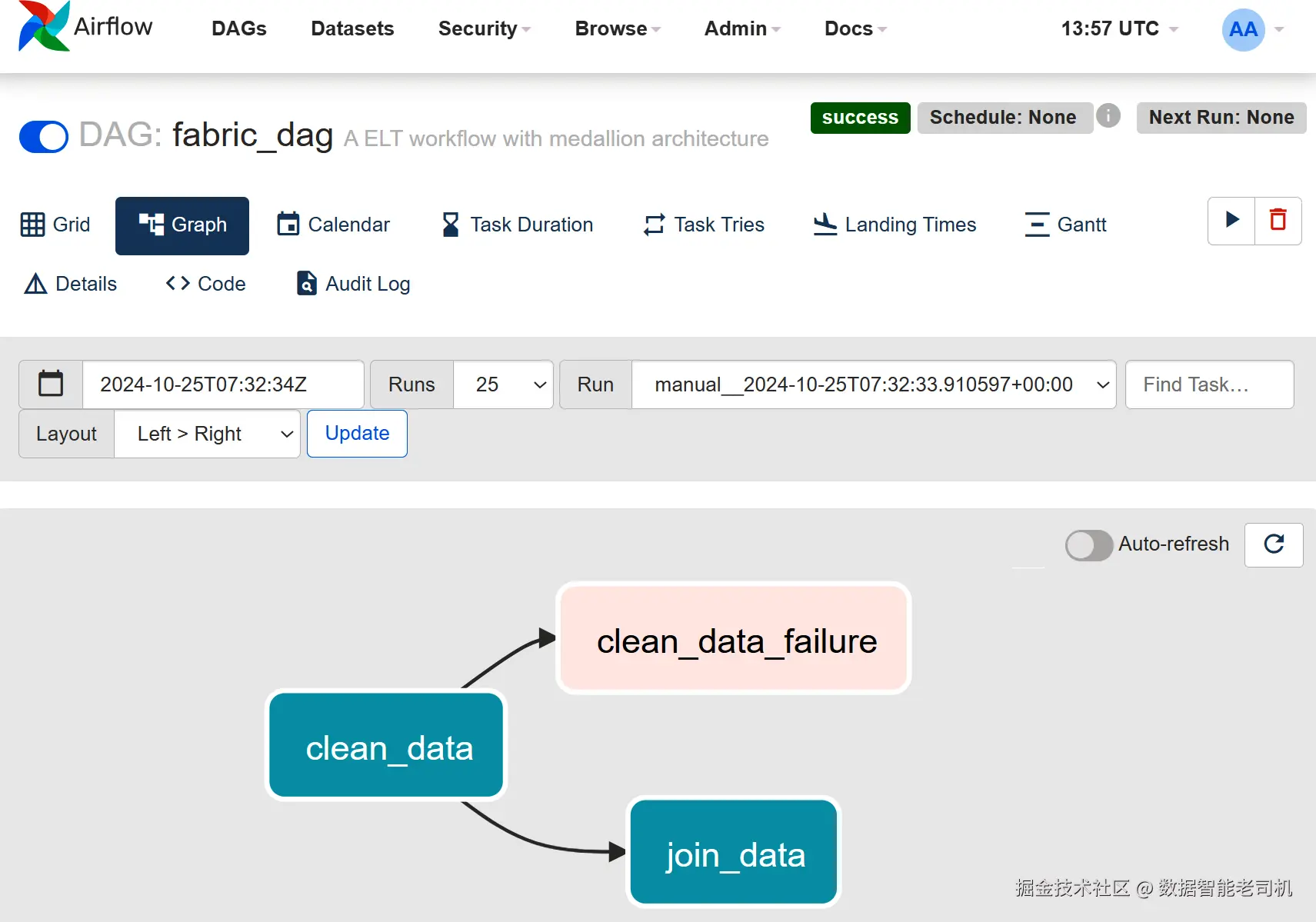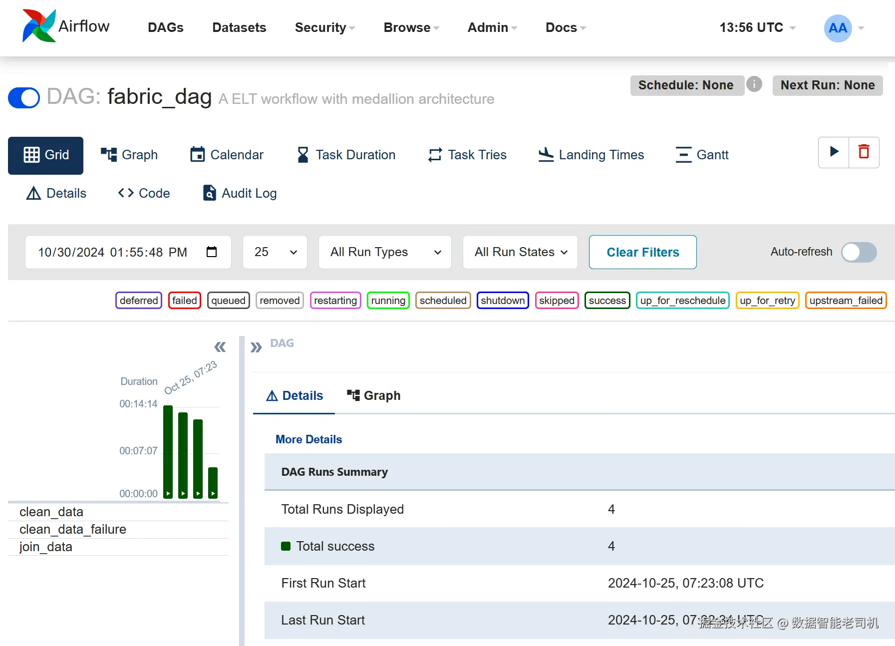 小结 :Apache Airflow 是强大且高效 的复杂数据工作流编排平台。它与 Microsoft Fabric 及 Azure Databricks 等服务深度集成 ;"用代码定义编排 "的方式带来更高的灵活性与精度,因此深受数据工程师青睐,用以简化与自动化数据工作流。