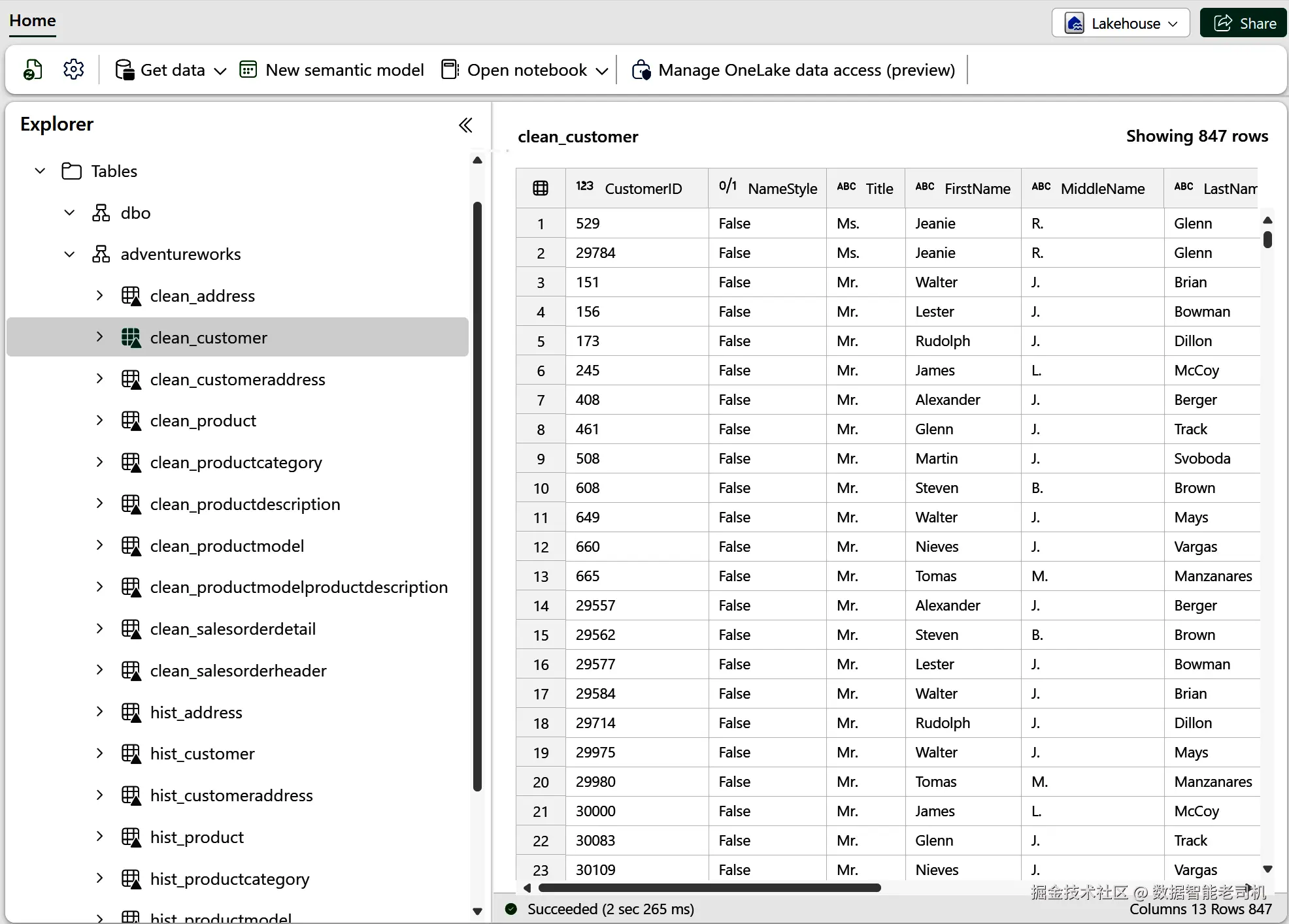 - 是在同一个 Lakehouse 实体 里用表名前缀(如