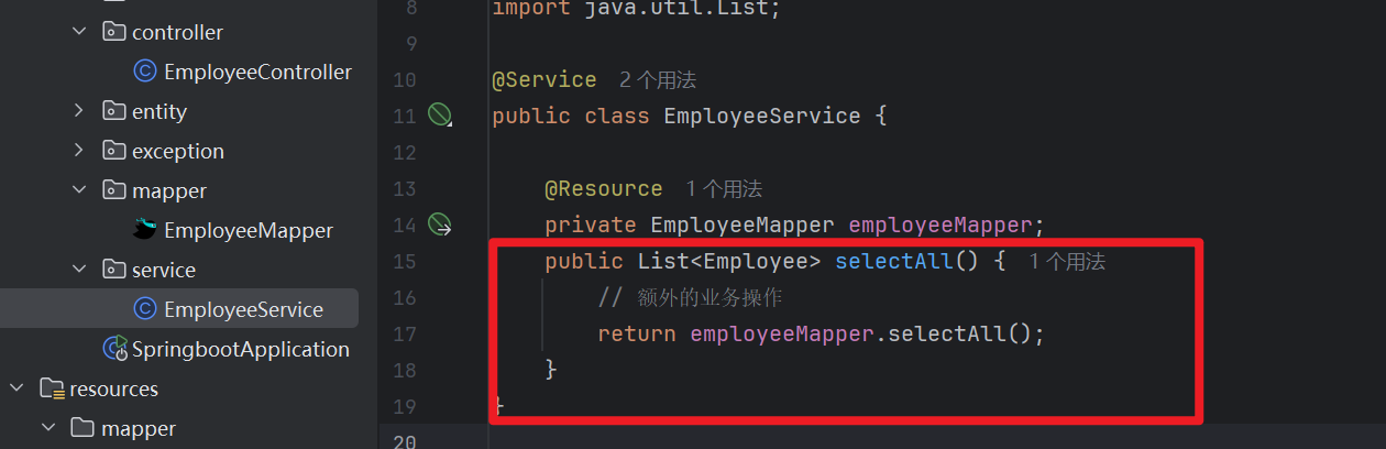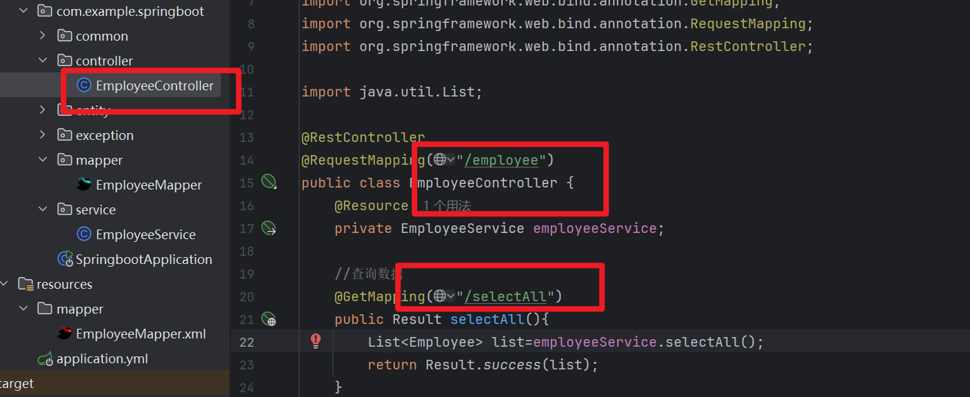 controller层代码(访问的时候,后面加/employee/selectAll)