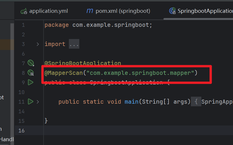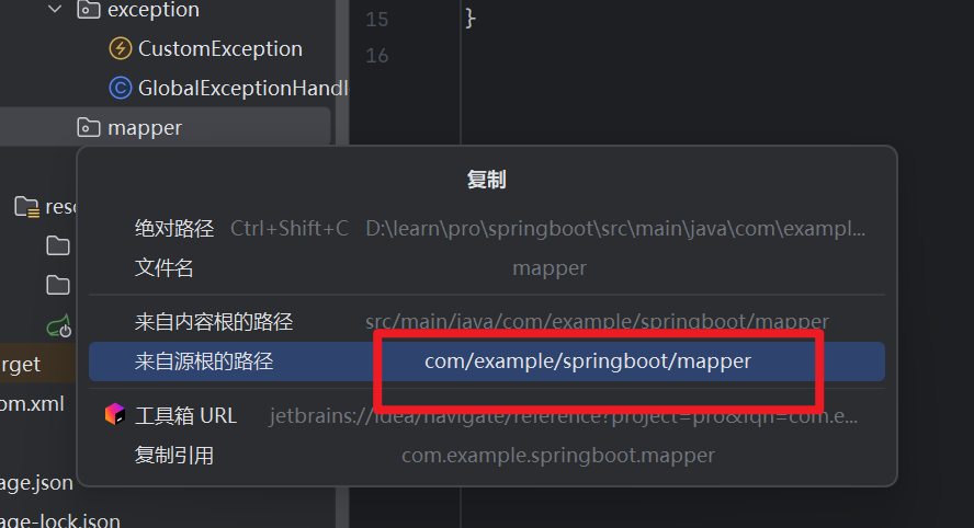 告诉Springboot如何扫描mapper包(路径可以按照下图方式找到,别忘记把中间的/替换成.)