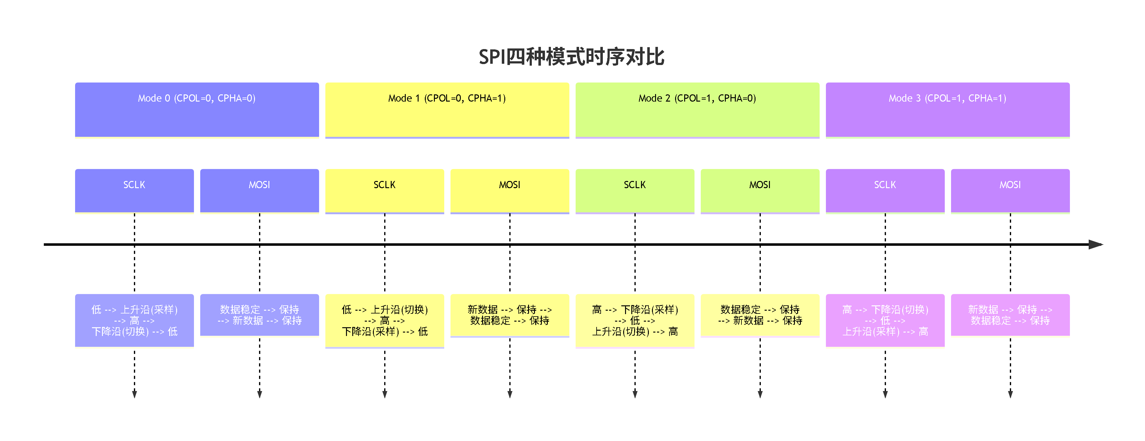 - 关键区别在于时钟空闲状态(CPOL)和数据采样时刻(CPHA)。