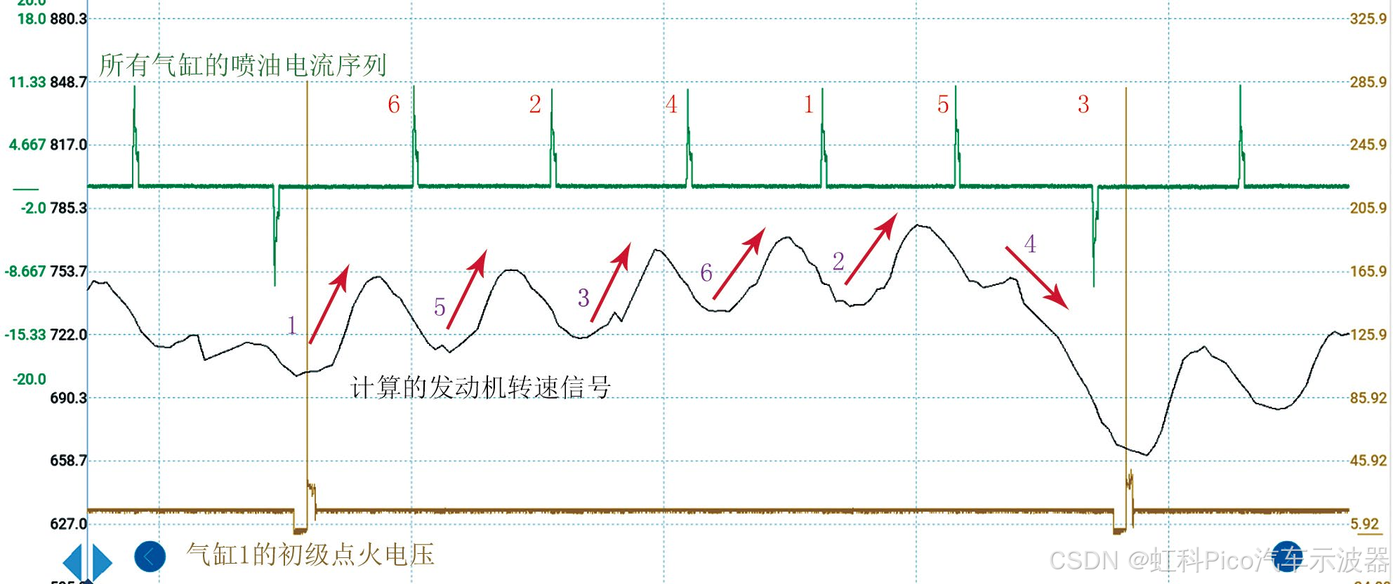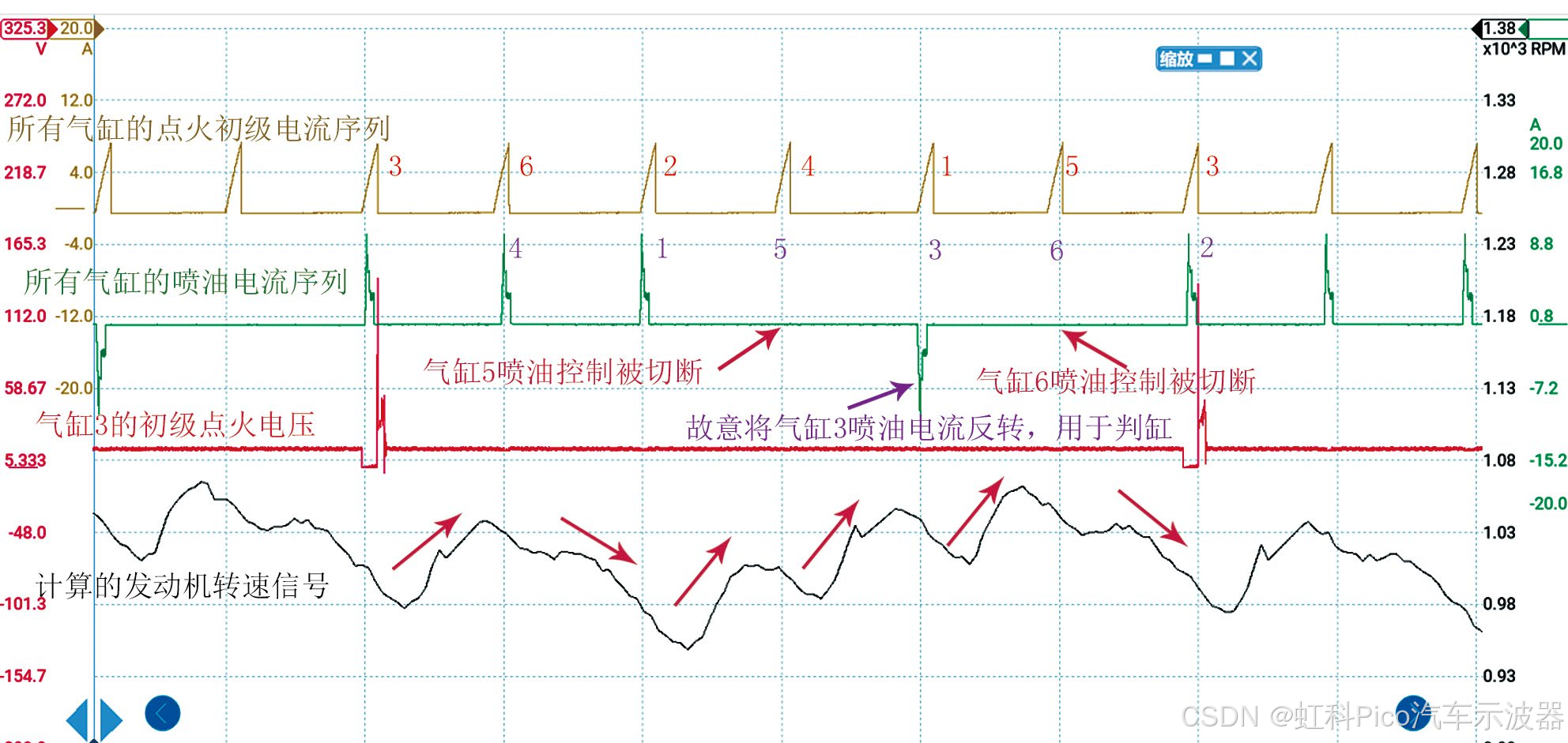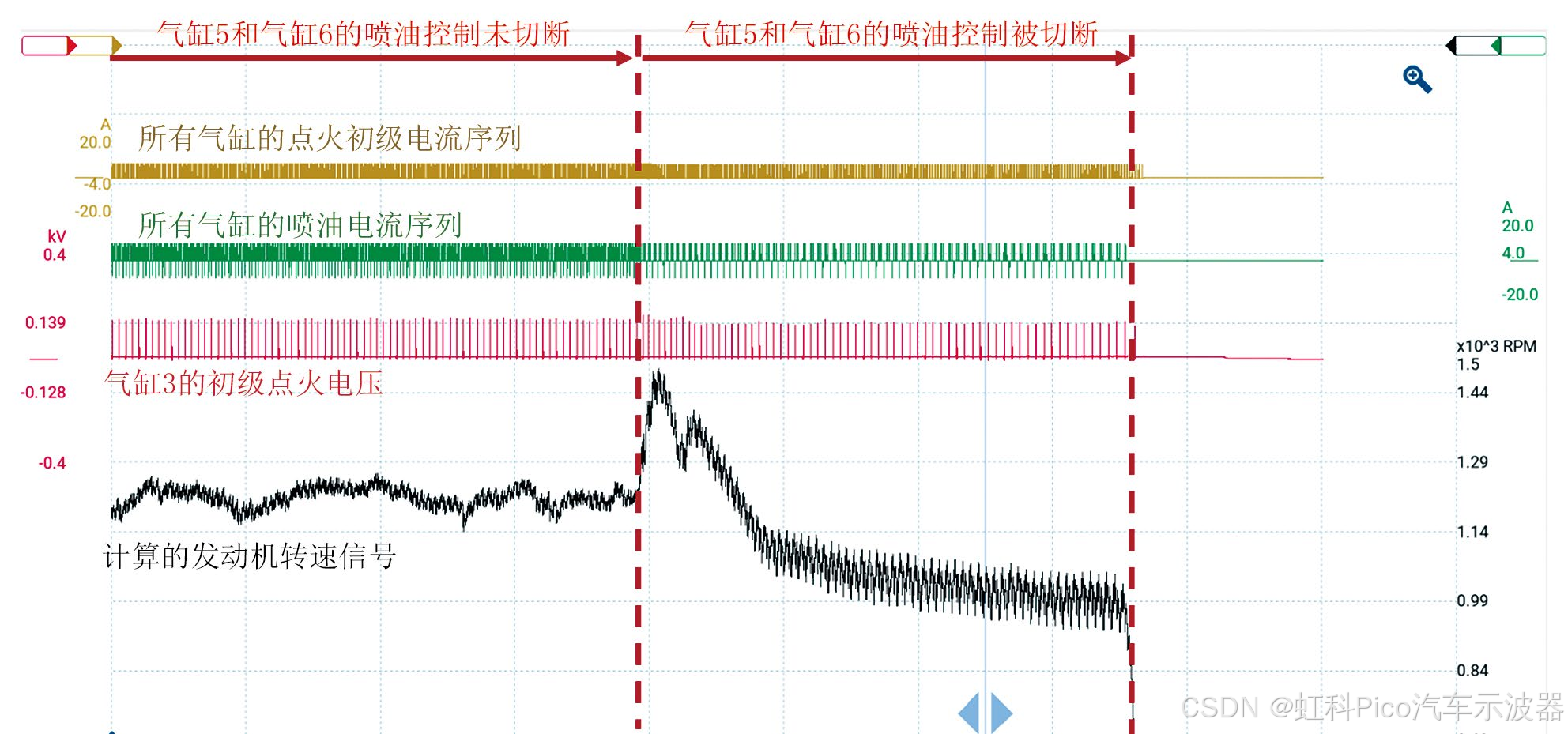 将车停放一晚,第二天早上试车,同时用虹科Pico汽车示波器测量相关信号波形。由图2可知,冷起动后发动机开始抖动,然后发动机转速突然升高,紧接着降低,此时发动机抖动变得更严重;局部放大发动机抖动严重时的相关波形(图3),发现此时气缸5和气缸6的喷油控制被切断,说明DME检测到气缸5和气缸6失火后切断了喷油控制。