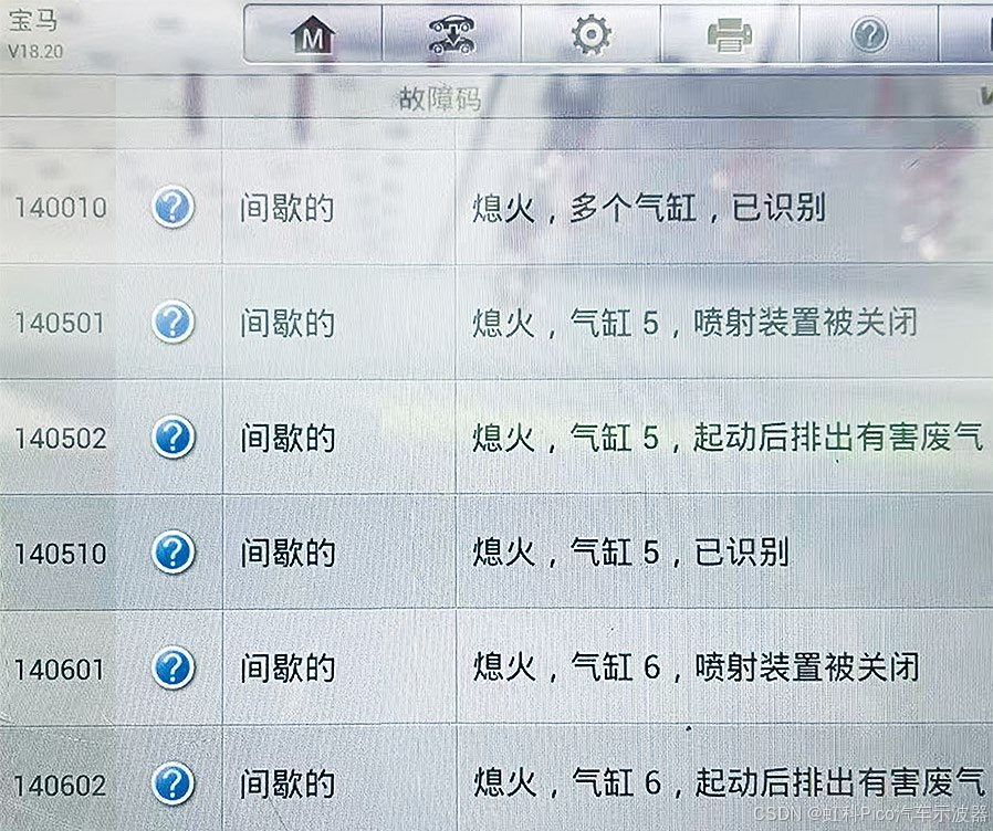 接车后试车,发动机工作正常。用故障检测仪检测,发动机控制单元(DME)中存储有气缸5和气缸6间歇失火的故障代码(图1)。