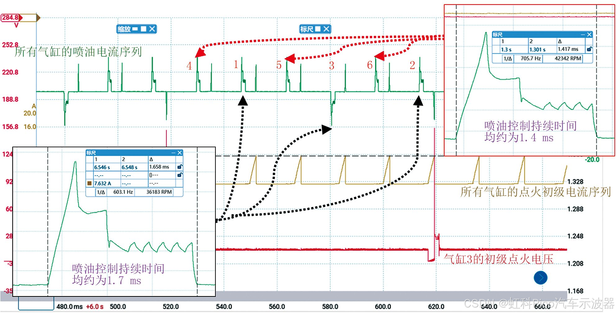 进一步分析波形(图4),发现在DME切断气缸5和气缸6的喷油控制前,气缸4、气缸5及气缸6的喷油控制持续时间均约为1.4 ms,而气缸1、气缸2及气缸3的喷油控制持续时间均约为1.7 ms。直列6缸发动机为什么会有2种喷油控制呢?这是因为气缸1、气缸2及气缸3的排气汇集到了一路,气缸4、气缸5及气缸6的排气汇集到了另一路,且两路排气管上均安装了氧传感器,用于反馈混合气浓度。诊断至此,推断气缸4、气缸5及气缸6的混合气偏浓,DME在控制减少喷油量。
