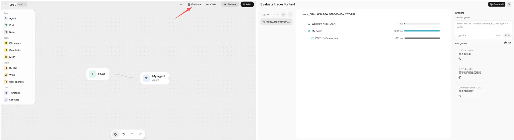 - Evals:自动化评估与优化,支持自定义指标和评估模型。