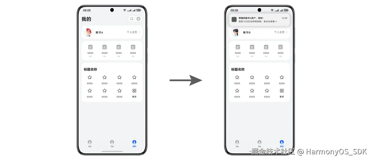 为解决这一问题,HarmonyOS SDK推送服务(Push Kit)推出了通知消息账号校验功能。该功能允许开发者根据终端设备上不同账号的属性来推送消息,确保通知精准地发送给对应设备上的对应账号。例如,在华为手机上,某个应用同时登录了账号A和账号B。当账号A切换至账号B后,原本发送给账号A的通知消息在到达设备后将不会展示,从而避免账号B看到账号A的消息。