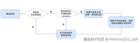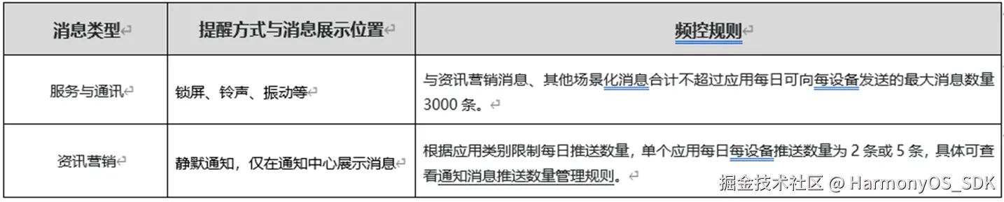 推送服务结合应用的消息内容和消息发送场景,将通知消息分类为服务与通讯类和资讯营销两大类别,并对不同类别的通知消息的提醒方式、消息展示位置、推送数量进行差异化管理。