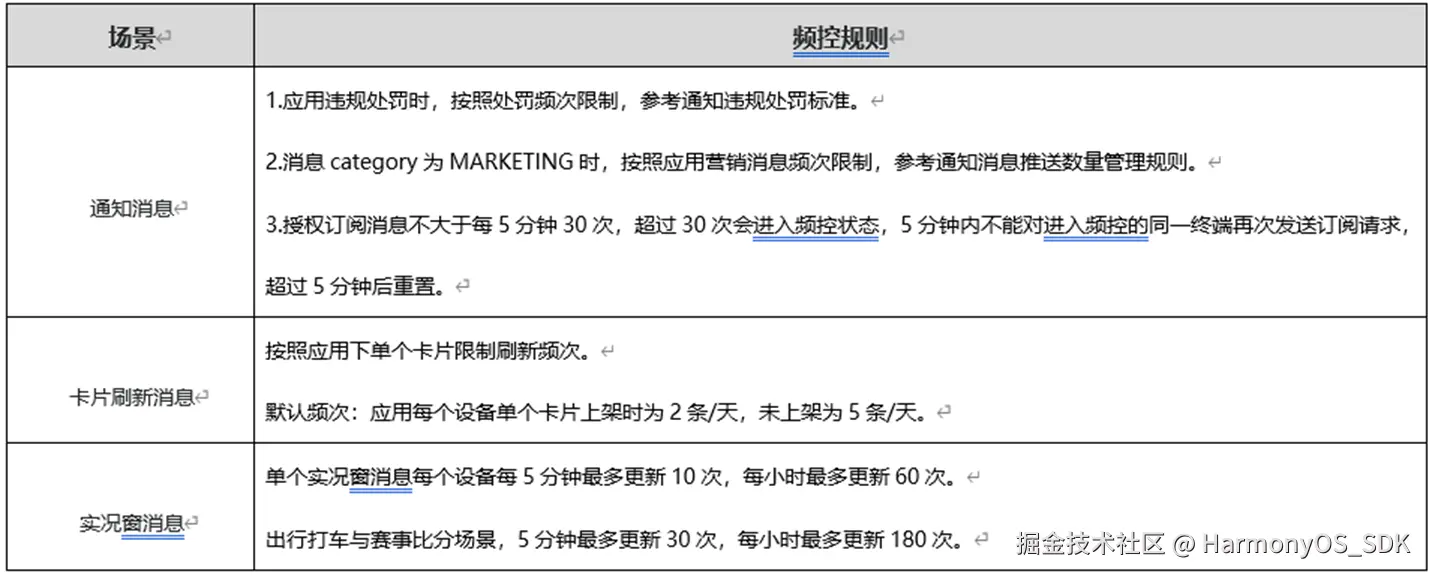 这里针对其中三种场景化消息进行了频控限制,包括通知消息、卡片刷新消息和实况窗消息,其中通知消息中包含了授权订阅消息。