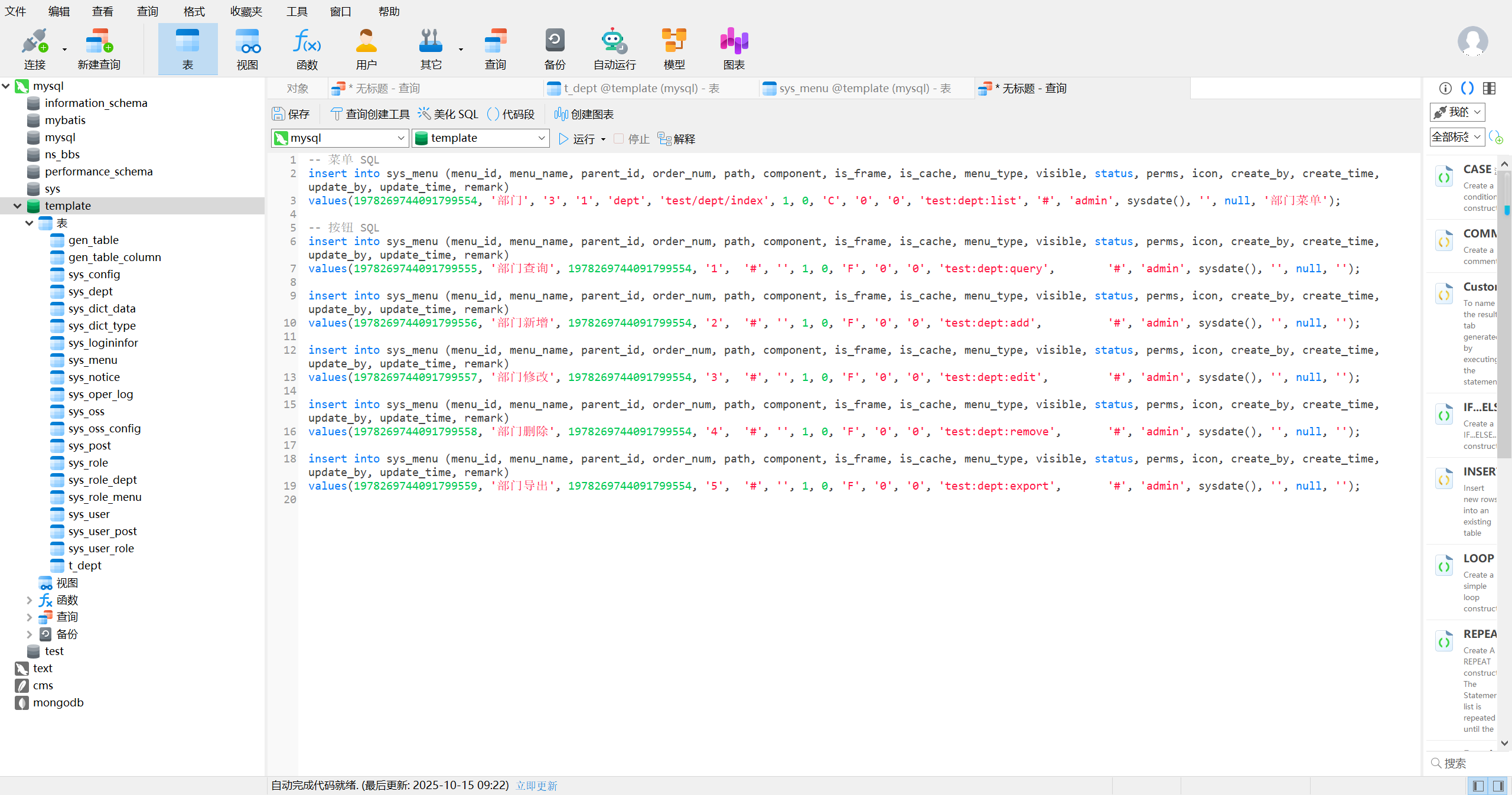 新建查询将deptMenu.sql插入运行