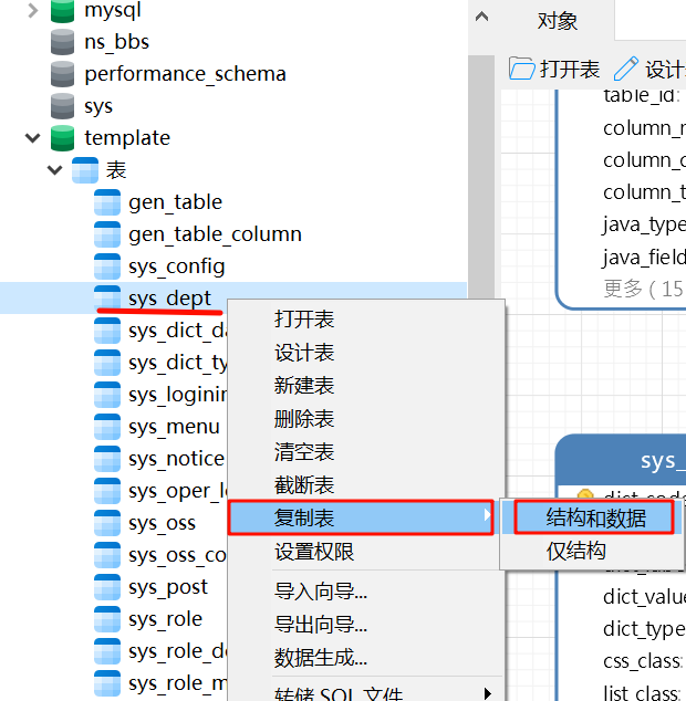 重启后,复制sys_dept,命名为t_dept