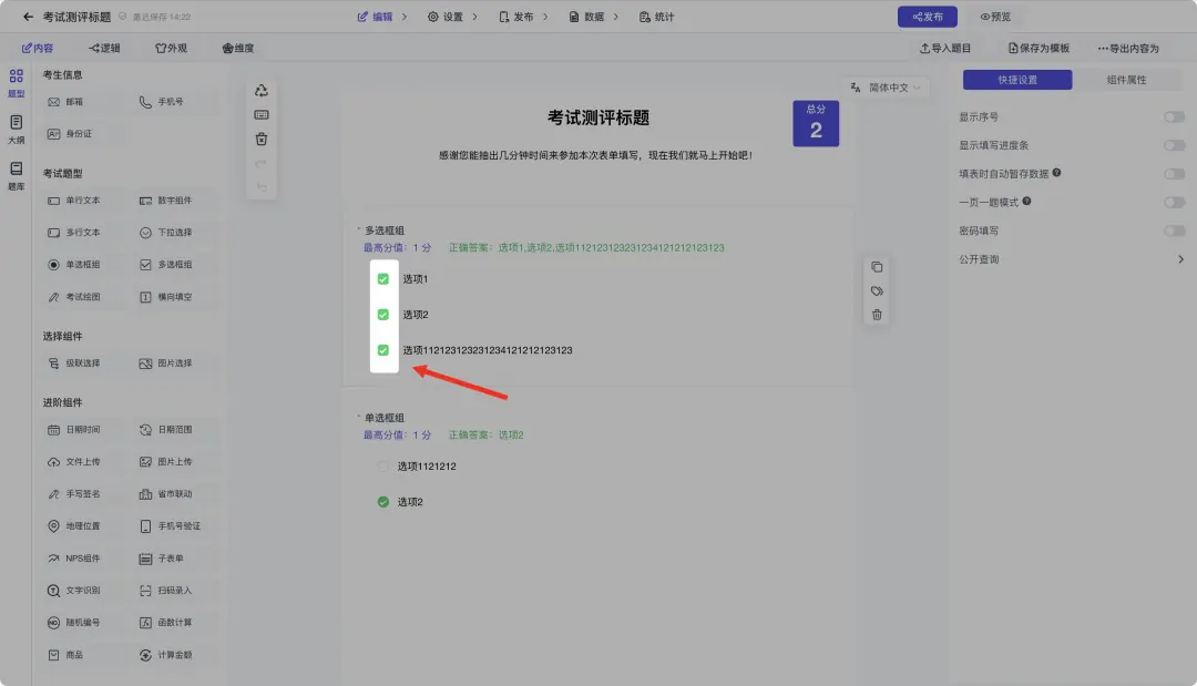 这个版本中,进行考试表单编辑试题时,我们可以直接点击选项直接来设置正确答案,不用在属性栏中逐个选择,这样可以让操作更直观,编辑效率也更高效。