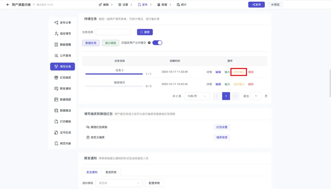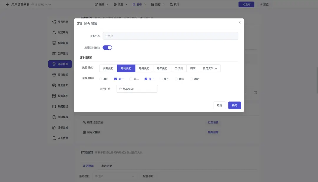 我们增强了目前的填写任务功能,现在您可以在任务设置里添加一个定时催办通知,设置之前先配置一个自定义提醒模板,支持邮件、短信、企微、公众号等常用渠道。并支持非常灵活的设置这个通知规则的周期,到达指定时间后,系统会自动提醒未填写的用户,再也不用手动催人填表了。