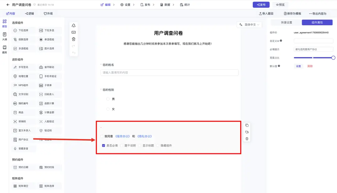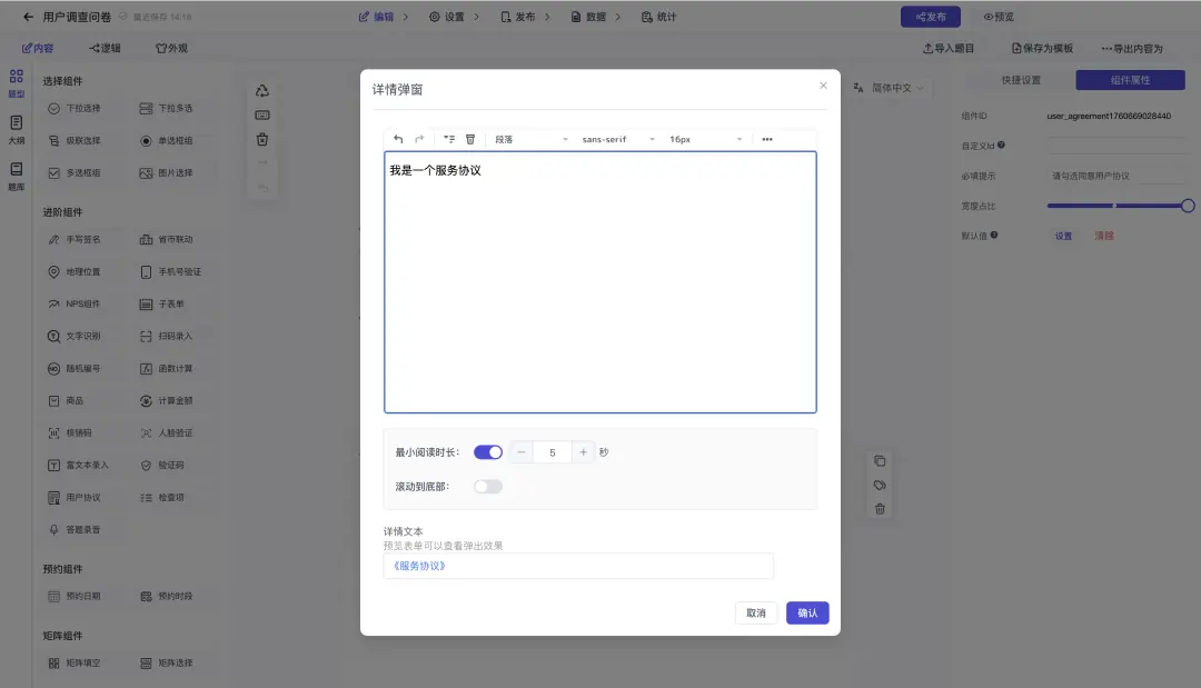 3.1 版本开始我们增加了一个用户协议组件,拖入组件后,可以在组件中设置协议内容、阅读时长、滚动到底部等功能;这样用户必须滚动到协议底部,并且达到设定的阅读时长,才能勾选同意并继续填写。这个功能非常适合隐私声明、报名条款等合规场景。