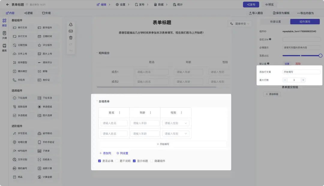 自增表单现在可以支持限制用户最多添加多少行,并且还可以支持自定义修改按钮文字,比如目前的"继续添加"可以改成更符合您业务场景的提示词,更贴合你的业务语言。