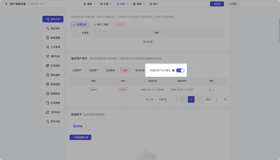 在这个版本中我们重新梳理了指定填写、待填任务的场景逻辑,增加了仅指定用户填写的开源,现在开启选项后,只有填写名单内的用户可以打开表单并填写,非常适合内部填报或特定群体收集等场景。