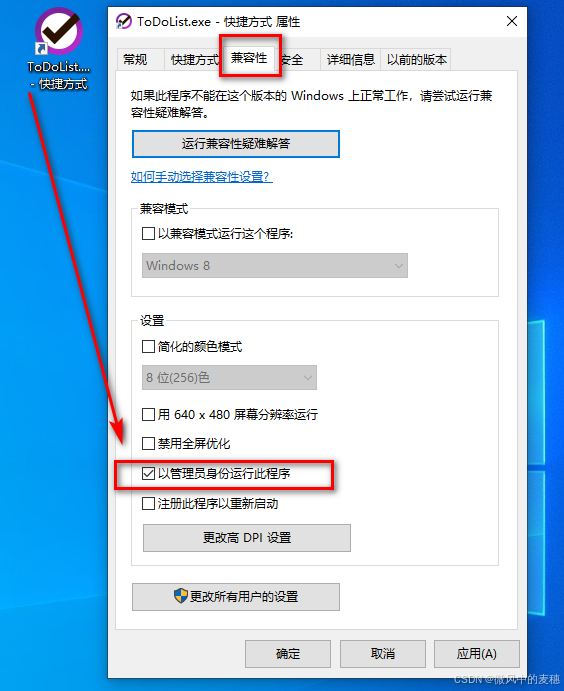 在桌面图标右键-属性-兼容性,勾选以管理员身份运行