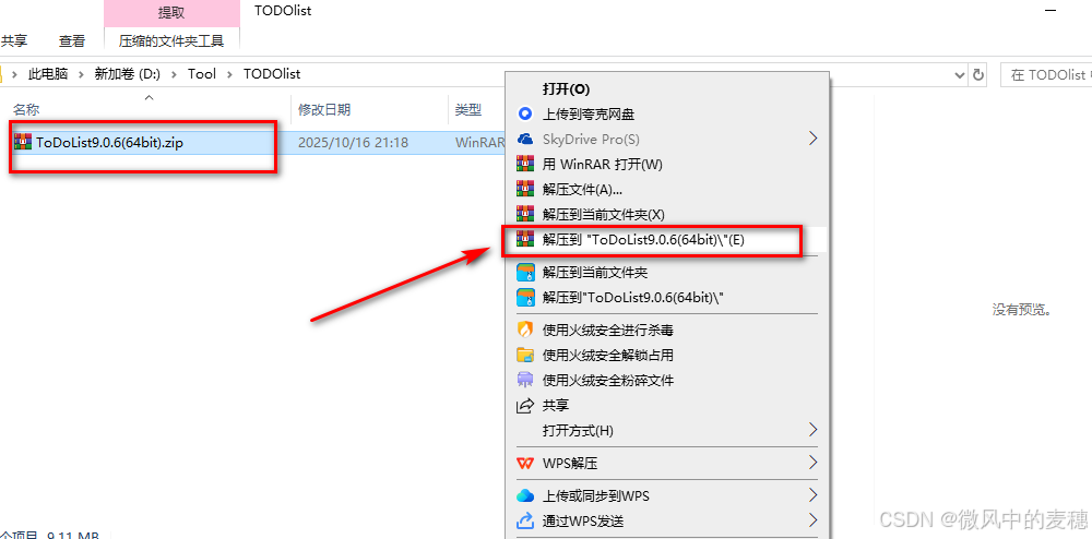 右键单击该文件,在弹出的菜单中选择 "解压到 ToDoList9.0.6(64bit)"