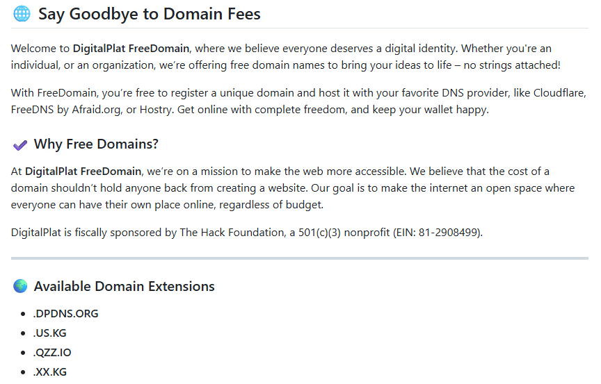 💡 推荐语: DigitalPlat FreeDomain为开发者提供免费域名解决方案,一键解析轻松搭建个人网站,开源免费无需付费。