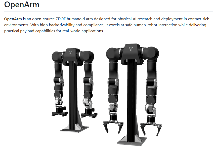 💡 推荐语: OpenArm是一个完全开源的人形机械臂项目,专为需要密集接触交互的AI研究与应用设计,为开发者提供低成本高灵活性的机器人手臂解决方案。