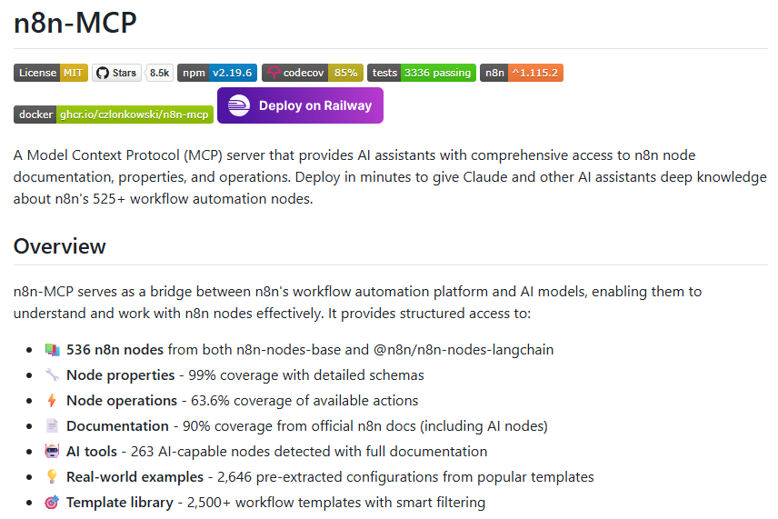 💡 推荐语: czlonkowski/n8n-mcp:用Claude等AI工具帮你自动生成n8n工作流的智能中间件,大幅提升自动化流程搭建效率!