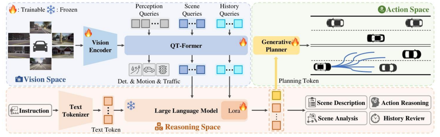 - 端到端⾃动驾驶的瓶颈:传统端到端⽅法在闭环评估中因因果推理能⼒有限,难以做出正确决策。尽管视觉语⾔模型(VLM)具备强⼤的理解和推理能⼒,但其语义推理空间与动作空间的数值轨迹输出存在鸿沟,导致闭环性能不佳。