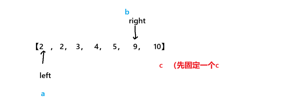 数组此时已经按照从小到大的顺序排列,我们可以从后固定一个c,然后一个left,一个right指针进行移动